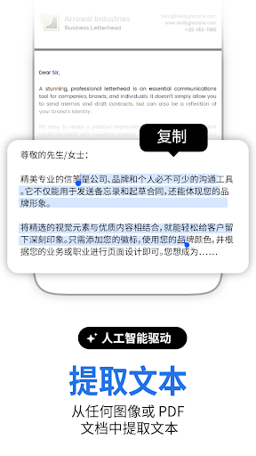 文字提取是一个图片转文字转换器,它可以从相机拍摄的图片中提取文字。文字提取支持图片转文字,图片转word,图片转excel,证件扫描仪和手写字转文字。<br><br>文字识别(OCR)<br> - 提取图片上的文字。<br> - 复制 - 屏幕上的文字。<br> - 在 OCR 之前裁剪和增强图像。<br> - 编辑和分享 OCR 结果。<br> - 批量扫描图像上的文字。<br> - 从图片(JPG、BMP、TIFF、GIF)中提取文本、字并转换为 Word、文档和doc、docx等输出格式。<br><br>图片到 Excel 转换器<br> - 优秀的 JPG 到 Excel 转换质量。<br> - 对文件大小或转换文件的数量没有限制。<br> - 屏幕截图也可以转换。<br> - 在任何地方共享转换后的文档。<br> - 从图片(JPG、BMP、TIFF、GIF)中提取文本并转换为 Excel、电子表格、xls 和 xlsx 输出格式。<br><br> 图片转Word<br> - 从照片和相机捕获的图片中识别文字和字符。<br> - 转换后的文档看起来与原始文档一模一样 - 表格、列和图形。<br> - 最佳图片到Word的转换质量。<br><br>证件扫描仪<br>- 扫描您的文件/身份证并转换为 pdf。<br>- 收据、文凭、文件、名片、驾驶执照、身份证、护照和银行卡 - 来自图像。<br> - 自动/手动提高扫描质量。<br> - 增强功能包括智能裁剪等等。<br> - 从图片(JPG、BMP、TIFF、GIF)中提取文本并转换为 PDF 输出格式。<br><br>手写字转文字<br> - 使用手写 ocr 转换器从图库图像或相机中转换文本。<br> - 准确的笔迹分析和 ocr。<br> - 裁剪和扫描部分文本。<br> - 不仅仅是手写;使用扫描仪图像到文本从任何图像中获取文本。<br> - 从图像(JPG、BMP、TIFF、GIF)中提取文本并转换为 Word、文档和文本输出格式。<br><br>多重识别<br>- 可以连续拍照转文字。<br>- 可以从相册中选择多张图片进行识别。<br><br>设计时考虑到隐私<br> 文本提取器对您的照片和文档是 100% 安全的。文档的创建是在您的设备上本地完成的。与其他应用程序不同,文字提取不会在远程服务器上处理您的文件。