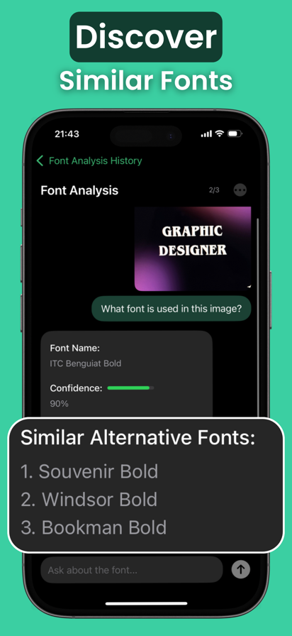看到喜欢的字体,拍张照片就能识别。Fonti利用AI技术,几秒内精准匹配100万+字体库中的字体。 Fonti能做什么 拍照即可获取字体名称、样式详情、免费替代字体和最佳搭配建议——一步到位。 核心功能 ・即时字体识别 — 拍摄任意文字,几秒内获取字体名称。AI分析字形、间距和风格,精准匹配。 ・100万+字体库 — 从经典衬线体到现代无衬线体,从手写体到装饰字体,覆盖全品类。 ・99%识别精度 — 经过数百万字体样本训练,行业领先的识别准确率。 ・免费替代字体 — 每个识别结果都附带免费替代字体,可直接下载使用。 ・AI字体搭配 — 不知道搭配什么字体?Fonti为你推荐和谐的组合方案。 ・聊天式字体咨询 — 随时向Fonti提问关于字体的任何问题,即时获得解答。 ・相机扫描(iPhone和iPad) — 使用实时相机或从相册选择图片。 ・Mac拖放操作 — 在macOS上,直接将图片拖入Fonti窗口即可。 ・完整搜索历史 — 所有识别过的字体都会保存,随时浏览、回顾和分享。 ・一次识别所有字体(高级版) — 图片中包含多种字体时,Fonti一次性全部识别。 适合人群 ・需要从客户品牌中识别字体的平面设计师 ・需要确认设计稿中字体的Web和App开发者 ・需要重建营销素材的市场营销人员 ・所有曾好奇"这是什么字体"的人 为什么选择Fonti 大多数字体应用只给出一个结果。Fonti提供完整方案:精确字体名、详细信息、免费下载和AI建议——一站式解决。 我们不存储你的图片。分析在设备端开始,仅传输AI处理所需的最少数据。 Fonti高级版 ・无限扫描次数 ・最佳AI模型,最高精度 ・一次识别图片中所有字体 ・完整字体详情:字重、样式和字体厂商 ・每次识别均提供免费替代字体 ・AI生成的字体搭配建议 ・完整搜索历史 可免费试用3天。提供周付和年付方案。 隐私政策:https://fontai.app/privacy 使用条款:https://fontai.app/terms