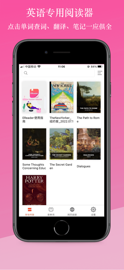 【英阅阅读器】是一款英语阅读利器,集分级词汇透析、mdict词典、背单词、阅读笔记等众多功能于一体,让您的英语学习事半功倍! 【八大特色功能】 1. 专为英语开发的阅读器: 结合MDict词典、AI翻译等功能让您轻松读懂英文名著、外刊杂志,适合英语精读; 2. 高效率查词: 点击单词即可查看释义, 便捷、高效; 3. 词汇透析: 透析书中单词,将词汇分为大学四级、六级、GRE、托福、雅思、专四、专八、考研等级别,让单词学习更有针对性 【独家支持法语、西班牙语等小语种词汇透析】; 4. mdict词典: 支持mdx、mdd格式词典, 可同时添加最多15部英汉、英英词典, 让一切生词无处可逃; 5. 背单词:生词本中保留单词所在的原文句子, 结合上下文复习起来印象更深刻,既可以重温句子,又能通过句子来强化单词记忆; 6. AI学英语: 通过与AI大模型对话学习英语, 让您的知识更全面、高效; 7. 阅读笔记: 阅读过程中可做笔记,划线、高亮都支持, 笔记支持导出anki、pdf、txt文本格式,便于整理、复习; 8. 支持导入外部epub、pdf、mobi、azw、azw3格式的电子书,支持Wifi传书、通过支持“Open in"的应用打开书籍。 EReader适用于iPhone/iPad通用,只需购买一份。如有任何疑问、建议,请发送邮件到 ereaderapp@163.com 邮箱,感谢您帮助我们进步。