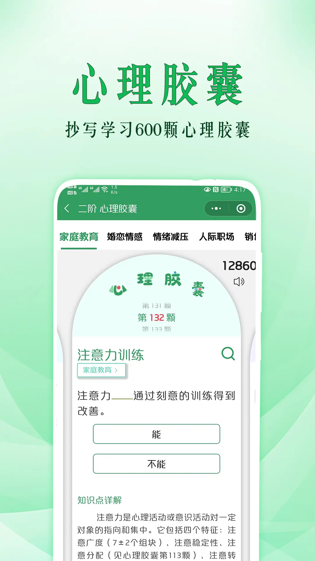喜欢心理学?心理学小白一枚?想解决自身情绪困扰?想帮助他人走出困境?想学心理学,但不知道哪种学习内容适合自己?<br> 51心理学,学了就能用。零基础也能学懂应用的心理学。不论你是高校学生,还是职场人员,或者是宝爸宝妈,均可学习使用。<br> 学习内容:600个心理知识点及8门心理学课程。600个心理知识点(文字内容),每一个知识点对应一个生活问题,用心理学专业词汇做出解释并提供应用方法。8门心理学(视频+音频),实现家庭教育+心理学全方面学习。<br> 学习方式:社群+自主学习。成为学员后,进入专属班级群学习,配备专业老师指导带领学习。由于本应用适用于成年人群学习使用,考虑到不同人群的需求,也可进行自主学习。<br> 截至2021年10月,51心理学用户已累计10w+,学员遍及全国34个省市,自治区。51心理学,致力于做老百姓都能学得起的心理学,做零基础也能学懂的心理学。