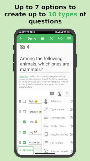 Test Maker 应用程序和 Quiz Creator 应用程序专门设计用于为所有学生和教师创建一个应用程序的每日问题集(测验/问卷),或者任何用户都可以将其用于考试复习和更多目的。<br><br>通过在问题创建者应用程序中添加您的书籍和考试问题。您可以通过经常回答或修改来加强您的学习。你可以一起看到你的分数。随时随地,无需任何互联网。<br><br><br>特征<br>1.创建问题集类别<br>2.通过打字和语音添加问题<br>3. 离线分享集和问题CSV文件<br>4.尝试,未尝试,问题展示<br>5. 您可以通过两种方式回答所有问题。 (i). 测试类型,(ii)。答案类型<br>6. 导入/投射 .CSV 问题文件,无需互联网<br>7.问题添加,编辑,删除现场您的本地存储<br>8. 设置重试并显示您选择的答案。<br>9.制作试卷pdf<br><br>Question maker app 是一款移动应用程序,可让您以简单直观的方式创建自己的测试。您可以创建测试并与任何人共享。<br>测试制作者或笔记制作者将帮助您以测试格式记住您想要的所有内容。只需输入考试的测试类别名称并添加您想要的任何问题。你可以通过反复练习这组来增加你的学习。<br><br>测验测试制造商。用户可以将所有数据保存为 CSV 文件或工作表文件,也可以相互共享。用户可以导出备份并恢复它。<br>竞争性考试真棒..一旦你写了你的时事,每天都可以很容易地从这个问题制作应用程序和计时器中修改。<br><br>Quiz Maker 是带有 *.csv 扩展名的文件的阅读器和编辑器。因此,它可以读取和执行存储磁盘上的测验/问卷文件。<br>除了它的编辑功能;它允许通过简单直观的界面编辑问卷文件,以便您可以轻松地从头开始创建自己的问卷文件或修改现有的问卷文件。<br>编辑测验时,您可以选择将其导出为可共享的 *.csv 文件,以便任何使用 Quiz Maker 和 mcq test maker 或兼容的 *.csv 阅读器的人都可以轻松阅读和执行它。<br><br>笔记:-<br>QuizMaker App 作为扩展名为 *.csv 的文件的简单阅读器和编辑器,当您将测验共享为简单的可共享和便携式 *.csv 文件时,接收者必须安装 Quiz Maker 应用程序/Test Maker 应用程序必须(或任何其他兼容的 *.csv 文件阅读器)来播放您的共享测验文件(*.csv 文件)<br><br><br>创建类别:-<br>简单的测试制造商应用程序。<br>单击加号按钮并输入类别名称和时间,然后单击确定<br><br>添加问题:-<br>单击问题类别的加号按钮。在第二个屏幕上单击顶部的大加号按钮。现在将出现问题添加屏幕。首先将问题放在大框中,并在其下方放置四个选项。勾选选项旁边圆点中正确的选项,然后点击添加问题按钮。<br><br>因此,您可以创建自己的测验、玩它并分享它以进行自我评估,甚至用于娱乐游戏目的。以及教师试卷制作应用程序。<br><br>为您的下一次考试创建试卷并将其转换为 PDF 与大家分享。您可以保存试卷 pdf 以供将来参考,然后返回并再次编辑。<br><br>我们有多种问题格式供您选择,并为您的试卷创建部分。根据您的需要轻松自定义试卷的标题。<br><br>使用 Quiz Maker & Creator,轻松玩、创建、保存和分享 MCQ、测验和测试。<br>这对于学习和练习几乎任何东西都是绝对完美的。只是填写细节和问题的最初步骤,如果做得好,测验是人生的财富。