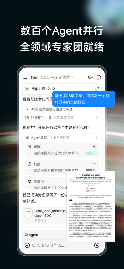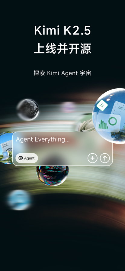 KimiK2.5模型正式实装,上线即开源。视觉理解、代码编程与Office办公能力全面进化。全新Agent集群能力同步上线,可自主创建分身Agent、组建团队、并行协作,整体效率提升超10倍。 可在应用内直接编程、创作、数据分析,生成PPT,还支持调用多种工具,高效解决复杂任务,成为你的随身Agent助理,只需一句话,即可获得高审美和可视化的结果。 # Kimi 能帮你做什么 - K2.5思考:支持多轮工具调用与思考,能逐步攻克数理逻辑难题,让搜索更广更准,帮你把想法化为清晰、富于创意、可用性高的文字与代码。 - Agent 集群: AI开始使唤AI干活了。Kimi现在也懂得创建自己的分身了!无论是海量文献综述、全网深度调研,还是超长行业研报撰写,它都能根据任务需求,现场调度多达 100 个分身,并行处理 1500 个步骤,将原本耗时的工作压缩至分钟级交付,实现 10 倍以上的效率提升。 - Office办公:Kimi 开始精通Office了!不仅支持 PPT、Word、Excel 与 PDF 的无损互转,更具备人类专家级处理能力:自动编写 Excel 复杂公式与图表,能够胜任Word/PDF 的专业排版与批注。 结合自主规划能力,它能智能调用多种工具,深度完成产品方案、网站搭建等全流程工作。繁琐的执行过程,交给Kimi Agent就好。 - 视觉编程: 告别代码门槛,对话即开发。支持上传设计稿、手绘图甚至操作录屏,K2.5能精准识别视觉细节,自动生成结构清晰、可维护的专业代码。从复杂的交互布局到细腻的滚动动效,均可像素级还原,所见即所得,让创意直接落地为可交付的网页产品 - 数据专业分析:K2.5 能够拆解复杂指令,对大型数据集进行深度分析,并能自动生成多种专业图表及分析报告。 - 辅助创作:可根据提供的网页链接、文件、内容风格,做你的内容创作脚手架,提供无限灵感。K2.5 能精准驾驭语言风格,懂语境,写出有温度、更具想象力的文字。 - 生成PPT:无需选模板,Kimi智能提炼核心内容,一键生成专业PPT。 - 深度搜索:高效搜索并整合全网信息,并提供精准信息来源,提供完善可信的搜索结果,辅助决策。 - 高效阅读:20万字长文秒速读完,快速提炼摘要与洞察,助你精准理解复杂文献与合同。 - 专业解读文件:专业解读金融、法律等领域文件。支持PDF、Word、图片等多种格式,可一次性处理多个文档,快速摘要、翻译、答疑。 - 整理资料:智能整理发票、会议记录等杂乱资料,自动提取关键信息,一目了然。 - 拍照答疑:拍照上传数理化难题或手稿,即使照片模糊、角度刁钻,也能迅速搞定。 无论你是程序员、科研人员、学生,还是互联网与法律行业的从业者,以及对AI好奇的所有人,Kimi旨在增强每一位专业人士与学习者的能力,让你从繁重的资料处理和内容创作中解放出来。 如果在使用过程中遇到任何问题,可在Kimi应用内“设置-点击头像-意见反馈”进行反馈。Kimi会珍视每一条宝贵建议,不断学习进步,给出更好的答案~ 用户协议: https://kimi.moonshot.cn/user/agreement/modeluse?version=v2 Kimi隐私政策: https://kimi.moonshot.cn/user/agreement/userprivacy?version=v2