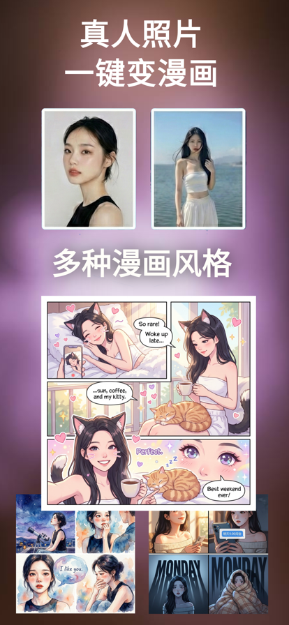 喵漫 (Catoon) - 释放您的想象力,让AI帮您讲故事,成为自己的漫画家! 想画漫画却苦于没有绘画基础?想把生活的精彩瞬间变成二次元故事? 喵漫 (Catoon) 颠覆您的创作体验!这不仅仅是一款照片转漫画的滤镜工具,更是一个强大的AI故事生成器。 只需上传照片或输入文字,AI即刻为您生成专业级的分镜多格漫画。 【为什么选择喵漫?】 零基础 AI 漫画生成 告别复杂的绘画软件!喵漫让创作像修图一样简单。 照片变漫画 (Photo to Comic): 上传自拍、萌宠或旅行照,AI智能捕捉特征,一键生成媲美手绘的二次元形象。 故事转分镜 (Text to Storyboard): 独家黑科技!输入一段文字故事,AI自动分析剧情,智能拆分画面,生成连贯的多格漫画。 16+ 种顶级画风库 无论您是日漫忠粉,还是韩漫追更党,喵漫都能满足: 韩系条漫 (Korean Webtoon): 清新唯美,色彩鲜艳,适合恋爱与日常题材。 经典日漫 (Japanese Manga): 黑白极简,热血动态,重现经典漫画书质感。 国风水墨 (Chinese Ink): 独特的东方韵味,古风雅致。 赛博朋克 (Cyberpunk): 霓虹光影,未来科技感十足。 吉卜力/皮克斯风格: 温暖治愈与3D立体质感的完美结合。 专业级分镜创作模式 智能模式: AI全自动排版,适合快速记录生活灵感。 手动模式: 自由调整分镜布局,添加气泡对话框,掌控每一个细节。 灵感模板: 预设“职场趣事”、“恋爱日记”、“萌宠日常”等模板,填空即成画。 专为社交分享设计 做朋友圈最靓的仔! 多比例输出: 支持 1:1 (Instagram/朋友圈), 9:16 (抖音/TikTok), 16:9 (宽屏) 等多种画幅。 高清保存: 作品自动云端备份,一键保存至相册,分享至社交平台,让您的朋友圈点赞爆棚! 适用场景】 生活手账: 用漫画记录旅行、美食与日常小确幸。 职场吐槽: 制作有趣的职场四格漫画,化解工作压力。 二次元创作: 为您的OC (Original Character) 生成专属剧情。 礼物定制: 制作独一无二的漫画贺卡,送给亲朋好友。 隐私条款和服务协议 - 隐私政策:https://docs.qq.com/doc/DT2NSVEJiZ2ZJVXR0 - 服务条款:https://docs.qq.com/doc/DT0xIQWJ1RkNwTnF2 - 自动续费协议:https://docs.qq.com/doc/DT2lzU2h6SEJRZERa
