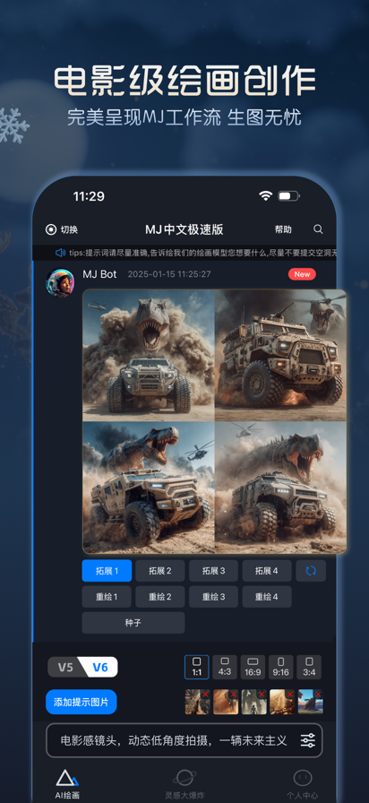 MJ中文极速版采用官方V6为您提供服务,您只需要尽情发散您的创意和想法,通过文字描述和图片提示即可由AI为您完成绘画创作!您的作品将由V6引擎模型进行绘制,一切体验皆如您所熟悉的那样,原汁原味,完美呈现! 10秒作画过程: 第一步,几组文字描述你想要的绘画内容,如果没有想法也没有关系,为您准备了灵感大爆炸,轻点尝试! 第二步,可选择添加您的提示图片,如主体的物体、绘画风格等的具体提示,开始创作! 第三步,只需要稍等片刻,属于您的创意大作将即刻呈现在您面前! 快来下载试试吧,我们在AI世界坐等您的驾临~ —————————————————————————— 【连续订阅协议】 https://www.guangll.com/useragreement#tab=Tab4 【使用条款(“标准EULA”)】 https://www.apple.com/legal/internet-services/itunes/dev/stdeula/