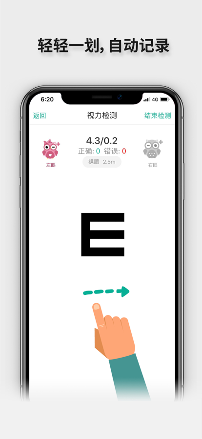 我要测视力应用程序为您提供一个自行居家检测视力的工具。 本App最大特色是根据手机像素密度自动计算视力检测符号的大小,保持和纸质视力表统一,以及通过离线语音命令来控制整个检测流程。从而达到独自一人也可以完成和纸质视力表效果一样的视力检测 本App的功能包括:检测方法说明、视力检测和视力结果显示 • 检测方法说明:用户运行本App后,首页会显示如何自己进行视力检测,主要要注意的是:1. 站在3米处。2. 手机高度尽量和眼睛平齐。 • 视力检测:用户开始视力检测后,系统开始倒计时等待用户站好。然后开始显示检测符号。用户通过语音命令:上/下/左/右/看不清来告知系统自己看到的结果。系统会根据用户反馈的结果,自行判断是显示更大或者更小的符号。直到检测结束。 • 视力结果显示:当系统检测到测试结束后,会将本次结果按照5分制或者小数制显示,供用户查看和保存。 • 本工具提供的视力检测功能结果仅供参考,如需专业检测请去医院或者专业机构。