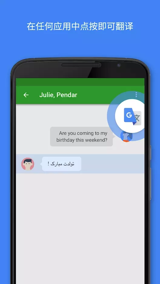 • 文字翻译:只需输入文字,即可在 108 种语言之间互译<br/>• 点按翻译:在任何应用中复制文字,然后点按“Google 翻译”图标,即可翻译(不限语言)<br/>• 离线翻译:无需连接到互联网即可翻译(支持 59 种语言)<br/>• 即时相机翻译:只需将相机镜头对准相应图片就能即时翻译图片中的文字(支持 94 种语言)<br/>• 照片翻译:拍摄或导入照片即可获取优质翻译(支持 90 种语言)<br/>• 对话翻译:实时翻译双语对话(支持 70 种语言)<br/>• 手写翻译:以手写方式输入文字字符,无需打字(支持 96 种语言)<br/>• 翻译收藏夹:点击星标收藏翻译的内容,以供日后参考(不限语言)<br/>• 跨设备同步:登录即可在应用和桌面设备之间同步翻译收藏夹<br/>• 转录:近乎实时地连续翻译使用其他语言的用户所说的内容(支持 8 种语言)<br/><br/>支持下列语言之间的互译:<br/>阿尔巴尼亚语、阿拉伯语、阿姆哈拉语、阿萨姆语、阿塞拜疆语、埃维语、艾马拉语、爱尔兰语、爱沙尼亚语、奥利亚语、奥罗莫语、巴斯克语、白俄罗斯语、班巴拉语、保加利亚语、冰岛语、波兰语、波斯尼亚语、波斯语、博杰普尔语、布尔语(南非荷兰语)、鞑靼语、丹麦语、德语、迪维希语、蒂格尼亚语、多格来语、俄语、法语、梵语、菲律宾语、芬兰语、弗里西语、高棉语、格鲁吉亚语、贡根语、古吉拉特语、瓜拉尼语、哈萨克语、海地克里奥尔语、韩语、豪萨语、荷兰语、吉尔吉斯语、加利西亚语、加泰罗尼亚语、捷克语、卡纳达语、科西嘉语、克里奥尔语、克罗地亚语、克丘亚语、库尔德语(库尔曼吉语)、库尔德语(索拉尼)、拉丁语、拉脱维亚语、老挝语、立陶宛语、林格拉语、卢干达语、卢森堡语、卢旺达语、罗马尼亚语、马尔加什语、马耳他语、马拉地语、马拉雅拉姆语、马来语、马其顿语、迈蒂利语、毛利语、梅泰语(曼尼普尔语)、蒙古语、孟加拉语、米佐语、缅甸语、苗语、南非科萨语、南非祖鲁语、尼泊尔语、挪威语、旁遮普语、葡萄牙语、普什图语、齐切瓦语、契维语、日语、瑞典语、萨摩亚语、塞尔维亚语、塞佩蒂语、塞索托语、僧伽罗语、世界语、斯洛伐克语、斯洛文尼亚语、斯瓦希里语、苏格兰盖尔语、宿务语、索马里语、塔吉克语、泰卢固语、泰米尔语、泰语、土耳其语、土库曼语、威尔士语、维吾尔语、乌尔都语、乌克兰语、乌兹别克语、西班牙语、希伯来语、希腊语、夏威夷语、信德语、匈牙利语、修纳语、亚美尼亚语、伊博语、伊洛卡诺语、意大利语、意第绪语、印地语、印尼巽他语、印尼语、印尼爪哇语、英语、约鲁巴语、越南语、中文(繁体)、中文(简体)、宗加语<br/><br/>权限通知<br/>Google 翻译可能会请求获取以下功能的使用权限:<br/>• 麦克风使用权限(语音翻译)<br/>• 相机使用权限(通过相机翻译文字)<br/>• 外部存储空间访问权限(下载离线翻译数据)<br/>• 帐号和凭据使用权限(在不同设备上进行登录和同步)