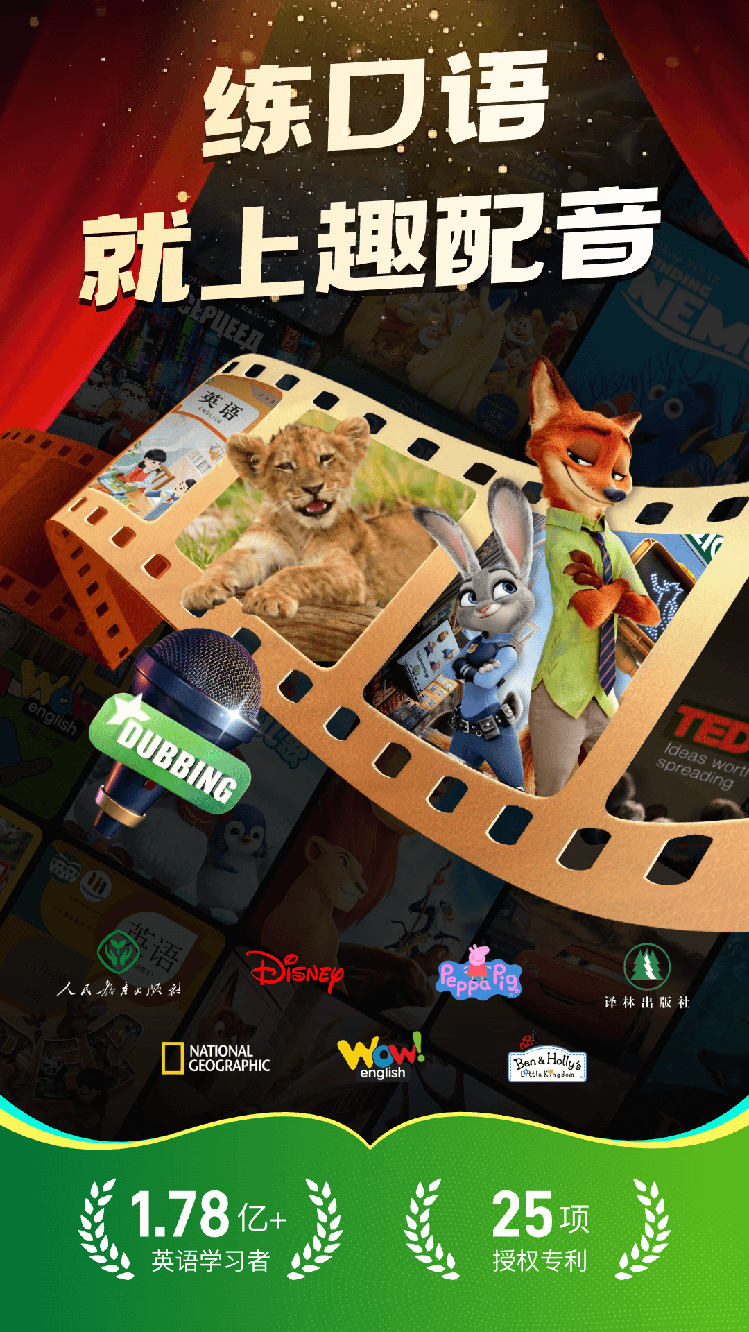 练口语就上趣配音!和1亿+小趣友一起学英语!<br>打通输出+输入学习闭环,让语言学习变得如此轻松好玩! <br>AI智能学习,实时反馈+实战训练,助你告别哑巴英语!<br> <br>------在英语趣配音可以做什么?------<br>玩着就可以学英语!<br>【练口语】为经典内容配音学英语,百万素材选你选,影视剧库、热门动漫、经典动画、英文歌曲、同步教材……<br>【练听力】你喜欢都可以随身听!视频一键转听力,听你想听,经典名著、必考词汇、英文演讲、历年真题……<br>【背单词】百万原声视频例句,让你身临其境背单词,AI词汇私教1v1,加强词汇场景记忆, 掌握实际运用。<br>【同步练】教材全覆盖,预习复习两不误,萌宠AI学伴添动力,背单词、读课文、刷真题、单元测,完整科学学习闭环。<br>【AI语伴】AI口语陪练,中英文聊天,零基础学习,双语讲解,场景自由聊,外教一对一辅导,有趣又有聊!<br> <br>------英语趣配音有什么?------<br>1. 趣味形式学语言,告别传统枯燥学习法。<br>【看视频学】百万精彩视频,看剧学英语,与主人公原声对话,沉浸式学习!<br>【听歌学】经典英文歌曲边唱边学,流行歌曲、怀旧金曲、影视原声……<br>【互动学】定期大赛,超多奖品等你拿,和大神切磋pk,还能邀友一起学!<br>【闯关学】游戏化练习,强化学习动机。知识点答疑,掌握重点难点。<br>【实战学】 费曼学习法,以用促学,实时任务监测,即时激励。<br><br>2. 多种趣味素材,覆盖多个领域。<br>【热门正版IP引入】迪士尼、小猪佩奇、巴塔木儿歌等官方正版授权,与主人公对话,身临其境学英语!<br>【多语种】全新日语、汉语的语种上线,更多语言学习选择。<br>【生词本】配音视频中的生词一键添加,覆盖语言学习生涯高频单词,加深单词场景使用记忆。<br>【多种词书】提供四六级、专四、专八、考研、托业、托福、雅思、GMAT、SAT、GRE等专业词书。<br><br>3. AI专业辅导,随时随地,在线学习。<br>【AI私教1v1】双语讲解,中英互译,例句引导,润色表达,打磨地道口语。<br>【专业打分】采用国家中高考口语打分系统,专业口语打分。<br>【实时反馈】音素级口语评测系统,AI智能算法多维点评,实时反馈发音语法问题并纠正。<br>【单词测试】可根据词书范围、数量、测试题型和时间速度进行个性化定制测试。