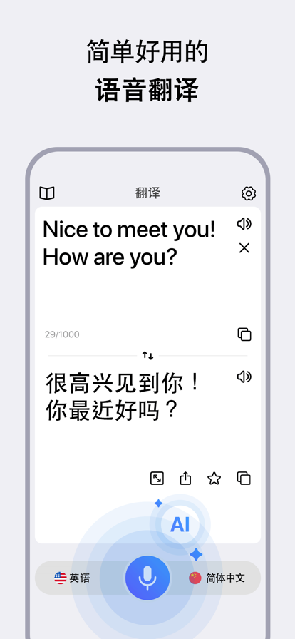 支持英/日/韩/西/俄/法/德/泰/越/印尼/马来/意/葡/土等多种热门语言翻译,支持语音翻译、同声传译、文本翻译、拍照翻译等功能。获得 2018「WMT国际翻译大赛」中英翻译冠军,日均翻译量已破 5 亿!满足翻译学习、口语练习、出国旅游、日常交流等需求。 更懂国人语言习惯,BLEU评测和专业人工评测,翻译质量领先行业,精准自然流畅。 【深受亿万用户和业界同行信任】 - 博鳌首家AI同传技术展示方 - 4 次荣获App Store精品推荐 - 爱范儿、少数派、小众软件等权威媒体自发推荐 【主要功能】 * 语音翻译 | 无需打字,按住说话,精准识别并翻译; * 同声传译 | 实时翻译,支持译文播报,炫酷又高效; * 拍照翻译 | 路牌、菜单、书籍、作业⋯看不懂的,一拍即译; * 文本翻译 | 翻译准确、地道,热门语言都支持;