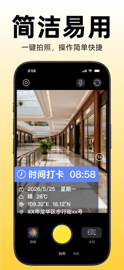 拍照片、拍视频,都能加水印。 水印上自带真实时间地点,防篡改! 好用的工作拍照App,各行业工作者的共同选择。 【适用场景】 工作质量记录、考勤打卡、物业工作记录、房屋验收、快递外卖、外出培训、会议记录等 【丰富的水印类型】 工作、时间、地点、经纬度、海拔、天气、心情、日记、特色等 【专业水印模板】 * 考勤打卡:真实时间地点无法篡改 * 工作记录拍照:物业管理、建筑工程管理、执勤记录、品牌宣传、会议记录等工作记录专属模板 * 实时更新:水印可自动更新为实时的日期、地点、天气等信息 * 自定义水印内容:可自由开关和编辑水印内容选项 一. 付款: 用户通过 iTunes 账户扣款, 用户确认购买后即付款. 二. 续订: 用户 iTunes 账户在到期前的二十四小时内扣费, 增加相应的订阅周期. 三. 取消续订: 如需取消续订, 进入"iTunes Store 与 App Store" —> 点击 "App ID", 进入 "账户设置" 页面, 点击 "订阅", 选择取消订阅即可. 四. 隐私协议: https://docs.qq.com/doc/DVHJBZnBTemFzY1N5 五.使用条款: https://docs.qq.com/doc/DVGZHeUxaQ1ZwZFdW