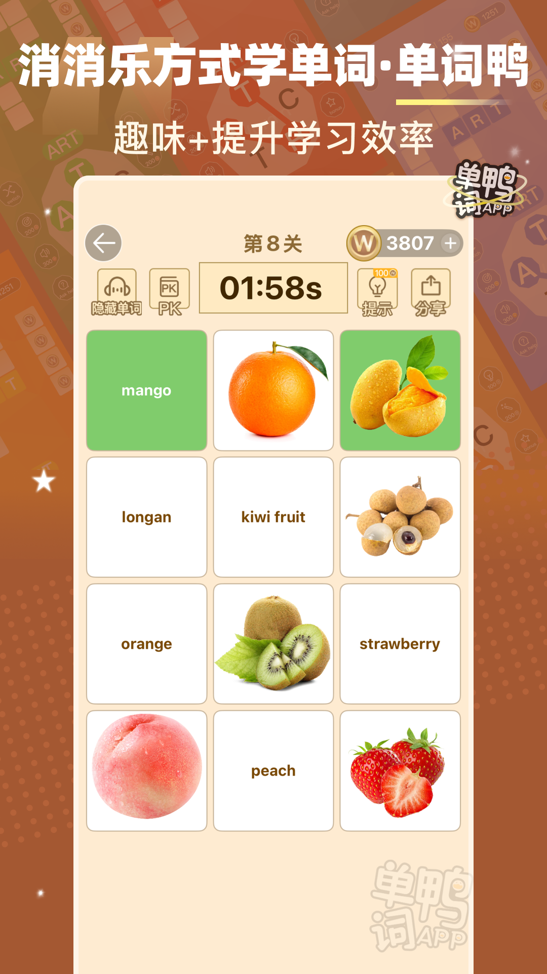 单词鸭是一款用消消乐方式学单词的软件.可自建词库,生成单词消消乐&记忆卡.用相机对着任意物品轻轻一拍,自动识别物品&给出物品单词音标释义,生成该物品的单词卡,收集周边物品的单词卡.像玩消消乐一样的消单词,像玩数独似的拼单词!摆脱传统枯燥无兴趣背单词,在玩中不知不觉学会单词,玩多久都没有浪费时间的罪恶感.关卡的生成算法基于艾宾浩斯遗忘曲线,千人千面抗遗忘 【趣味学英语】 单词消消乐·像玩消消乐一样的消单词 单词数独·像玩数独似的拼单词,难度系数高 将己会的词加入斩掉,后续关卡不会再出现己斩的词 【拍物收集单词】 用相机对着任意物品轻轻一拍,自动识别物品&给出物品单词音标释义,生成该物品的单词卡,收集周边物品的单词卡 【自建词库】 上传文件,无需自行调整格式,导入单词和词组短语 多种创建方式,可通过拍照录入、EXCEL模板导入、单个录入、批量录入的方式创建自己的专属词库 单词卡不限语言和科目,如英语,西班牙语,日语,德语,语言学习、医学、法律、数学、社会科学... 可以搜索并学习其他同学创建的单词卡 【海量词库&教材同步配套】 小学/初中/高中/四级/六级/考研/剑桥/托福/雅思/托业/GMAT/GRE/SAT/职业英语...全阶段 小学/初中词库,多版本教材与课本同步,贴合学生校内课本单词 如果没有符合自己的词库,可自建词库 【记忆卡】 左滑不认识,右滑认识,不认识的自动进入生词本 用记忆卡学习任何语言,无论英语,日语,西班牙语等 【测评】 全方位测评听说读写的能力,让每一个单词都成为四会单词 【写一写】 三步法(临摹写->填空写->听写)轻松掌握单词写法 【单词PK】 在线PK,一起学习有动力 【班级&学情统计】 创建班级,邀请朋友和同班同学一起组队学习单词 与朋友和同班同学之间分享自建的词书词库 【休闲化&碎片时间】 每天10-15分钟即可循序渐进,通勤、排队、等待时间不浪费 动动手指就能消单词,像玩消消乐一样,指尖轻点,即享畅快 【词根记忆】 背单词太难?试试词根记忆,抓住单词规律,轻松记住一大串 别死记硬背单词啦!用词根记忆,记一个顶一群,词汇量飞涨 学单词有捷径!词根记忆法,让你一眼看透单词,背得又多又快