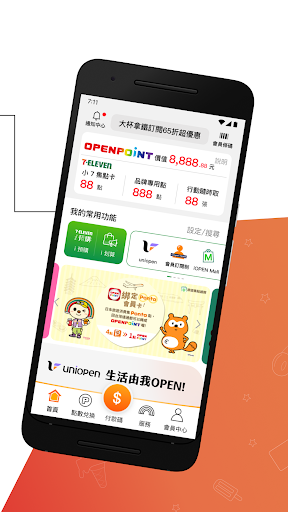 【合作通路】<br>7-ELEVEN、康是美、家乐福、速迈乐加油站、21世纪生活馆、Mister Donut甜甜圈、COLD STONE酷圣石冰淇淋、Semeur圣娜多堡....等。<br><br>【点数介绍】<br>会员于7-ELEVEN消费出示uniopen会员条码、报手机号码或使用icash2.0或OPEN钱包皆可轻松累积点数,点数可折抵消费或兑换超值商品。<br><br>【功能介绍】<br>1.累积-查询最新点数优惠情报、累点通路及活动。<br>2.兑换-优惠商品及合作通路优惠券兑换。<br>3.查询-消费获得的OPENPOINT点数。<br>4.绑定-常用icash2.0(联名卡)绑定,使用更便利。<br>5.支付-OPEN钱包、icash Pay及云端开心卡支付超方便!<br>6.服务-ibon 售票、列印、缴费、寄件、储值、红利、购物及生活服务。<br>7.集点-小7集点卡,集点、兑点更EASY!<br>8.发票-消费存发票,专属对奖/通知领奖更贴心。<br>9.团购-i划算,一人即享团购价。<br><br>【支援规格】<br>自此版本起,手机支援的规格调整如下:<br>- Android系统6.0以上的版本<br>请于上述建议使用环境下升级或安装应用程式,否则可能导致APP无法使用<br><br>※提醒您,为确保您的帐务安全,请于行动装置安装防护软体,以保护行动装置的安全。