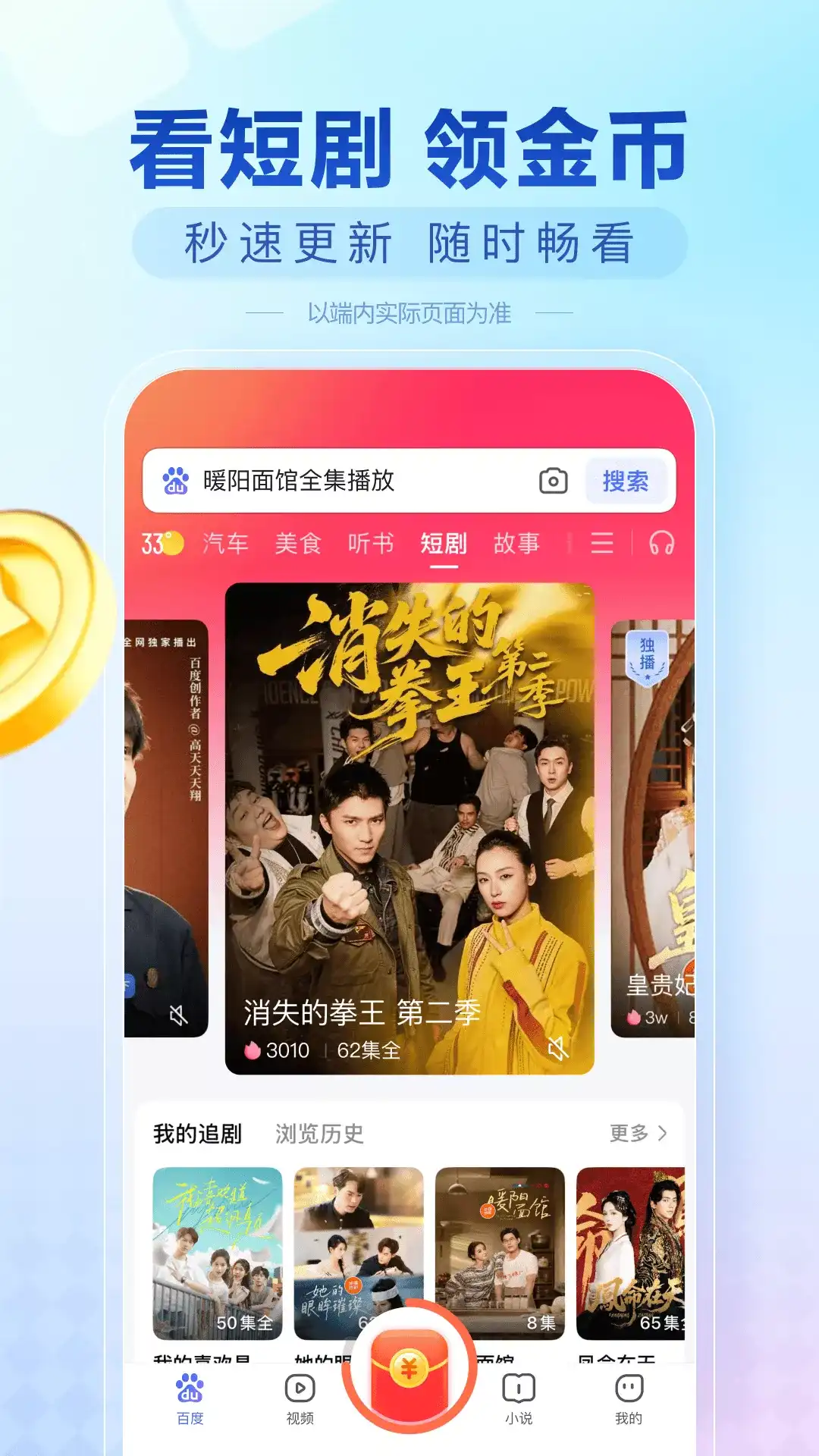 百度App,数亿用户优选的搜索和资讯客户端。更懂中文的语音搜索识别技术。热门新闻、视频抢先看,更有全网正版小说,海量独家短剧。 【智能搜索】 强大的搜索引擎,搭载文心一言大模型,多模态搜索,所见即所得,更深度、精准理解你的搜索意图,快速识别图片内容,直达你想要的结果。 【热门资讯】 精选新闻资讯、视频、漫画等优质内容,热门评论置顶显示,查看、互动更方便。 【文心助手】AI全能助手,即时解决你的所有问题。深入研究、深度搜索,为你解决复杂问题;AI拍题,一键解惑学习难题;AI生图、AI生成视频、AI写作,精彩内容跃然屏幕,还能AI语音通话、视频通话、文字聊天,带给你全新的AI体验! 【短视频】 首页底部快速进入视频频道,海量明星娱乐、搞笑段子、经典剧集视频,还能拍小视频记录身边新鲜事,简单操作能拍又能看。 【语音识别】 加入更懂中文的语音识别技术,新增方言识别能力,支持语音播报资讯,精准理解你的语音指令,即使在嘈杂环境中也能清晰识别,沟通无障碍。 【小说/短剧】 海量正版小说、短剧随心看,小说支持书架列表、阅读进度可多台设备自动云同步。短剧涵盖都市、爱情等多种题材,智能推荐,精准匹配你的短剧喜好。