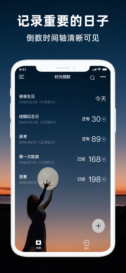 时光倒数APP——倒数你的重要日子。 妈妈生日是什么时候?跟恋人在一起多久了?还有多少天发工资?什么时候还信用卡?来到地球多少天……不要再掰着手指头数日子啦,快使用时光倒数APP吧!! 作为一款非常有意义的日期记录提醒软件,有了它,你可以轻松记录各种生日节日纪念日等重要日子,再也不用担心太忙而遗忘了。软件还拥有强大的倒计时功能,帮你精准计算并提醒你距离重要日子还剩多少天,让你提前做好准备,避免错过造成遗憾。 目前,时光倒数APP拥有5大实用功能,满足你对日期的所有记录需求: 【倒计时】未来值得期待的日子。如8个月后高考,9个月后宝宝出生。 【纪念日】过去值得纪念的日子。如与ta已经在一起100天,距离上一次上台演讲过去200天。 【生日】重要的人的生日。如父母、朋友、同学、伴侣的生日。 【节日】仪式感的节日。如春节、中秋、国庆、元旦等等。 【生命日】倒数你的生活,记录生命的流逝。 【自定义背景】内置各种精美的背景任你挑选;支持图片本地上传自定义背景,打造个人专属记录软件。 【农历设置】支持公历和农历两种设置模式,满足你的日期记录需求。 【桌面组件】将重要的日子快速添加到桌面,随时查看避免忘记。 【重复事件】可设置年月周天重复事件,方便一次设置,多年生效。 【智能提醒】自定义提醒时间,系统准时提醒,再也不怕忘记啦。 【正倒计时】倒数计和正计时,轻轻一点随意切换,日期计算精细到每分每秒。 【生日短信】支持自动发送生日短信祝福,可提前定制贺卡编辑文案,系统准点推送,get最佳卡点时间。 在重复单调,快速流逝的岁月里,时光倒数App帮你抓住珍贵的记忆,制造满满的仪式感! 【会员自动续费服务说明】 --订阅周期:1个月、1年 --付款:您的iTunes账户会在购买确认后立即扣款 。 --续订:您的iTunes账户会在到期前24小时内扣费,扣费成功后订阅周期顺延一个订阅周期。 --取消续订:如需取消续订,请在当前订阅周期到期前24小时以前,手动在iTunes/Apple ID设置管理中关闭自动续订功能。 --隐私政策:https://sgxwap.weilaizhushou.com/member/version2/agreement/privacy_importantDay.html --自动续费会员服务协议:https://sgxwap.weilaizhushou.com/member/version2/agreement/vipAgreement_importantDay.html