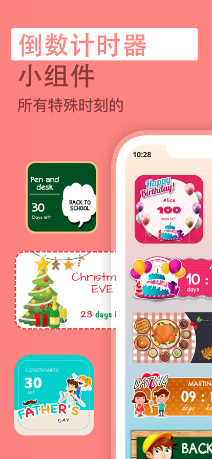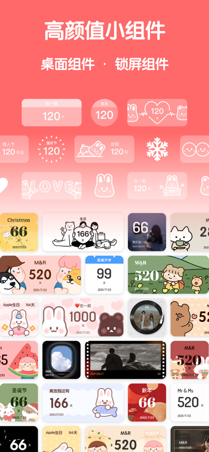 我的倒计时是一款免费且功能强大的时间记录提醒工具。 iOS14已支持精美的倒计时桌面小组件,锁屏倒计时,请注意更新~ 可用于记录:考试倒计时、生日提醒、节假日倒计时、各种纪念日、情侣恋爱天数、单身天数、生命倒计时等等。 让您不再错过生命中的每一个重要日子。 ===特色功能=== 1、两种主题风格:全屏、简约,满足不同喜好。 2、大量高清图片,动态壁纸,滤镜效果,让倒计时更美观 3、支持3种提醒方式:按周期定时提醒、提前提醒、重要日子提醒。支持置顶事件图标小圆点,不错过每个重要日子。 4、支持App内录屏保存,分享到短视频平台,个性化表达您的心情。 5、iOS14添加精美的桌面小组件,设置精美桌面主题。 6、iOS14.3以上系统支持锁屏倒计时。 7、支持数据备份,更换手机更方便。 您的支持是我们改进的动力! QQ交流反馈群:782815038