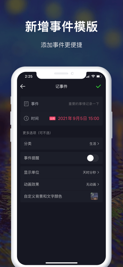 纪念日提醒,一款记录重要事件、纪念日,提供纪念日提醒、倒计时提醒的实用工具。 通过产品“还有xx天”的准确提醒,你可以未雨绸缪,更加合理地利用自己的时间。 还有丰富的事项图标和好看的背景图片供你选择哟~ 纪念日提醒用处多多! 使用场景: 1、约会/恋爱/结婚倒数:记下这些你和ta的重要日子,提前准备礼物和惊喜吧 2、生日/聚会/旅游倒数:爸妈生日时回家、和朋友一起出游,都是相聚的美好 3、中考/高考/考研倒数:距离考试还有xx天?快来制定一份你专属的学习计划 4、五一/国庆/春假倒数:设置各种法定节假日,期待放下工作/学习的自由时光 5、事件/任务/项目倒数:重要事项不容错过的截止日期,纪念日提醒会及时提醒你 6、女性生理期倒数:提醒你距生理期还剩多少天,帮助你摆脱尴尬的小情绪 …… 功能特点: 1、自定分类:如工作、生活、节日、纪念日等 2、事件置顶:将最重要的纪念日提醒事件置于首位 3、快速添加:快捷入口,便于添加常用节假日 4、隐私保护:输入密码才能进入纪念日提醒的页面 5、一键分享:纪念日提醒事件形成后可以分享出去 6、通知样式和纪念日封面:新增多款通知中心样式,可自定义纪念日封面 订阅说明: - 订阅VIP后,您可以开启时间提醒,解锁通知栏样式,并解锁所有封面图和分类图标包 - 订阅提供3个时间段的VIP服务,包括:一月VIP服务,三个月VIP服务,一年VIP服务 - 订阅每月1.49美元,每季度3.99美元(免费试用3天)和每年13.49美元(美国地区 - 购买过程是从itunes账户中扣除购买款项 - 订阅自动更新,付费帐户到期后将自动续订,除非在本期结束前至少24小时关闭自动续订 - 账户将在当前期限之前的24小时内以所选套餐的费用收取费用 - 订阅可以由用户管理,自动续订可以在购买后转到用户的账户设置中去关闭 - 如果提供免费试用期的任何未使用部分将在用户购买该出版物的订阅时被没收 - 您可以访问(长按) https://www.camoryapps.com/netpower/privacy_policy/daycountdown_cn.html 来阅读我们的隐私政策 - 您可以访问(长按) https://www.camoryapps.com/netpower/service/daycountdown_cn.html 来阅读服务条款 -如果提供免费试用期的任何未使用部分将在用户购买该出版物的订阅时被没收 价格相当于“苹果App Store矩阵”所确定的相当于以美元为单位的认购价。