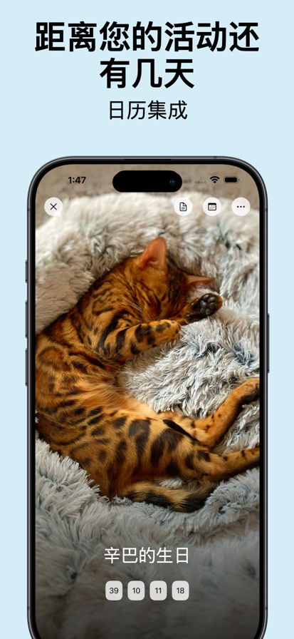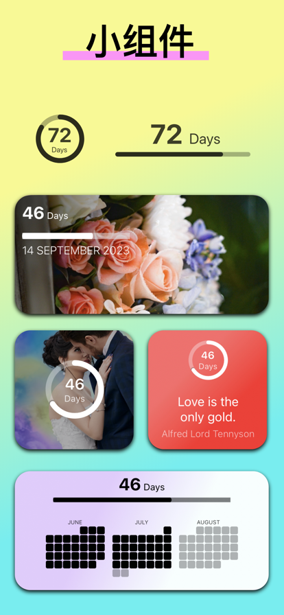 为你重要的时刻倒计时。 生活中的小事最为珍贵。生日、纪念日、婚礼和与亲朋好友共享的时光。Days 帮助你倒计时,记录这些特别的时刻。 倒计时与正计时 所有的活动都会被永久保存,无论是倒计时假期,还是回顾结婚纪念日。 倒计时日历 在一个屏幕上查看你所有的生活事件,轻松滑动,每个事件都有美丽的全屏照片。 锁屏小组件 无需解锁手机即可查看倒计时,iOS 16 现已支持锁屏小组件。 主屏幕小组件 直接从主屏幕倒计时,支持精美的小组件。 重复事件 为每年、每月或每周的事件倒计时。再也不会错过生日和纪念日。 精美体验 Days 以细致的设计为核心,优美的动画与图片让你的倒计时体验与众不同。 直观的滑动 滑动即可轻松切换事件,快速浏览每个事件。 倒计时提醒 无需打开应用,我们会提醒你距离事件还有多远。 更多精彩 免费下载 Days,体验为什么用户认为我们是 App Store 上最好的倒计时应用。我们不断开发新功能,期待你的反馈! 查看我们的条款、条件和隐私政策: https://daysapp.co/privacy & https://www.apple.com/legal/internet-services/itunes/dev/stdeula/