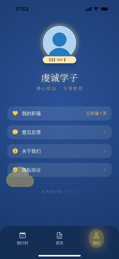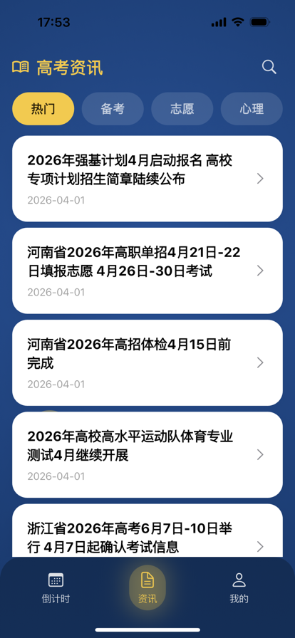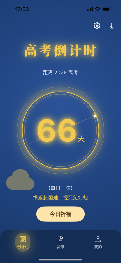 「核心功能」 1.“高考倒计时”支持多维度时间展示:首页动态显示距离高考的天、时、分、秒,帮助考生合理规划复习节奏。同时,产品融入“高考求签”趣味功能,每日提供励志签文、学业运势解读,结合考生心理状态生成个性化鼓励话语,在紧张备考中注入轻松氛围,缓解焦虑情绪。 2.趣味高考求签内置丰富的签文库,涵盖学业运势、心态调整等内容,通过趣味化方式缓解考前焦虑,为考生提供心理慰藉和正向激励。每日一签,开启积极备考状态。 「产品优势」 界面简洁清爽,无广告干扰,专注备考场景,让您不再错过生命中的每一个重要日子。