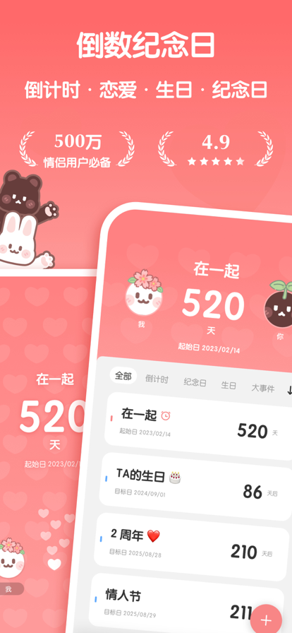 恋爱纪念日(Memories Widget)是一款帮助您记录生活中重要日子的纪念日提醒应用,可倒数或正数计算重要日子的天数。支持记录情侣恋爱天数、结婚周年纪念日、生日、倒计时、假期、高考、重要事项等,让您不再忘记每个值得纪念的日子。 【记录恋爱天数】 ▸ 还记得和另一半相爱多长时间了吗?输入恋爱开始的日期,可以一目了然地查看在一起的天数。 ▸ 快速查看和另一半的纪念日,例如相恋100天、恋爱一周年、520天、1314天和各种纪念日(情人节、七夕)等。 【情侣互动空间】 ▸ 情侣空间:做任务赚金币,和另一半一起精心装饰“小家”。 ▸ 萌宠陪伴:与另一半一起喂养宠物、探险寻宝藏、与萌宠温馨互动... ▸ 心情气泡:发表每日心情,告诉TA你的真实感受。 ▸ 冰箱便利贴:在冰箱贴上暖心留言,共同提醒彼此。 ▸ 纪念日:将自己的纪念日共享给TA,共同纪念日子。 ▸ 照片墙:换上一张甜蜜的情侣照,共同表达爱意。 【日期计算器】 ▸ 正数、倒数计算结婚周年纪念日、生日、恋爱日、高考、假期、重要事项,不再错过值得纪念的日子! ▸ 可倒数某个即将到来的重要日子,或计算过去某个重要日子至今的天数。 ▸ 支持设置农历 / 公历日期。 【重复周期和通知提醒】 ▸ 纪念日重复周期设置:按每天、每周、每月、每年重复。 ▸ 重要日子智能提醒:按当天、提前、累计天数提醒。 【自动排序】 ▸ 按创建时间、天数、日历的方式排序日期,可帮助您专注于即将到来的纪念日。 ▸ 将某个重要日子设定为重要的一天(置于顶部)。 【云端备份和恢复】 ▸ iCloud云端同步,自动备份数据,保护你的重要资料。 ▸ 现在支持多设备(iPhone、iPad)同步恢复数据。 ▸ 你可以通过AirDrop直接将备份共享到附近的iOS设备。 【桌面小组件和锁屏小组件】 ▸ 提供数十款可爱的主题风格,在主屏幕上(iOS14+)可同时创建多个纪念日小组件。 ▸ 您可以自定义编辑小组件,包括修改字体样式、字体颜色、主题颜色和背景照片。 ▸ 您可以选择经典/甜蜜样式的锁屏小组件添加至iPhone锁定屏幕上(iOS16+),让您快速查看必要的信息。 ▸ 横屏充电新玩法,多种精选StandBy待机组件(iOS17+)供你选择。 【心情日记本】 ▸ 结合普拉切克情绪色彩的可爱表情,用治愈且轻松的方式,完成此刻的心情记录。 ▸ 用图片、文字记录恋爱日记,生活点滴。 ▸ 用日历视图随时翻阅以往心情日记。 ▸ 支持深色 / 浅色模式 如果您有更好的建议请联系我们,谢谢! 反馈邮箱:memorywidget@126.com 或在应用中的“设置”→“我要吐槽”提交反馈。 【会员订阅功能】 您可以在应用内使用iTunes自动续订功能获取会员专属功能,我们提供「按月订阅」和「永久会员」套餐。确认购买后,将会从您的 iTunes 帐户中收取费用。您可以在每个周期结束至少 24 小时前取消下个周期的订阅,每个周期结束 24 小时内将会自动续订,已订阅的周期将无法取消。 取消预订:如需取消预订,请在当前扣费期间前至少24小时操作,操作方法:【设置】->点击【Apple ID】->点击【订阅】,选择连续包月情侣VIP取消订阅即可。 ▸ 隐私政策:https://encofire.com/memories/privacy.html ▸ 用户协议:https://encofire.com/memories/terms.html ▸ 官方网站:https://encofire.com/memories ▸ 小红书号:Memories365