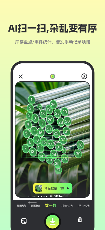 识物计数——您的智能视觉清点助手,通过手机拍照即可快速、准确地统计各类物体数量,适用于工程、仓储、生产、生活等多种场景,让繁琐的点数工作变得轻松简单。 无论是工地管材、仓库物料,还是日常生活中的零散物品,识物计数 App 都能帮您节省大量时间,提升效率高达 98%。 【智能拍照计数】 对准目标拍摄或上传照片,App 自动识别图中物体并实时显示统计数量,结果精准,一目了然。 【多场景适配,识别种类丰富】 专为建筑、餐饮等行业设计,可智能识别并统计以下常见物品: 建材类:钢管、钢筋、方木、圆木、盘扣、轮扣、钢踏板等 生活类:竹签 复杂场景也能准确识别,一键完成清点! 【功能亮点】 极速识别:基于 AI 视觉算法,秒出结果 记录追溯:自动保存历史清点记录,随时查看 标注自定义:支持调整标记颜色与样式,让结果更直观 一键导出:生成带标记的结果图,方便保存、分享或汇报 持续优化:团队持续更新算法,识别更准、速度更快 识物计数 App,致力于为您提供高效、可靠的一站式智能点数解决方案。