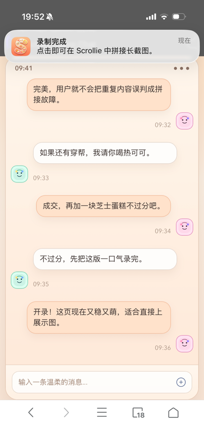 Scrollie 可在几秒钟内将屏幕录制或连续截图转换为一张干净、无缝的长截图。 无论您是保存聊天记录、社交动态、网页还是笔记,Scrollie 都能让长内容的捕捉、编辑和分享变得简单。 主要功能: • 自动将屏幕录制转换为长截图 • 将多张截图拼接成一张无缝图片 • 智能重叠检测,实现更干净、更自然的效果 • 智能清理功能可检测并移除长截图中的滚动条 • 内置编辑工具:涂鸦、马赛克和水印 • 草稿自动保存,让您随时暂停和继续 • 高质量导出,方便保存和分享 隐私优先: 所有处理都在设备上完成。您的截图和录制内容不会上传到我们的服务器。 滚动、拼接、分享。 应用内购买: • 终身 Pro 访问权限 • Pro 按月订阅(1个月) • Pro 年度订阅(1年) 价格可能因地区而异,请以应用内购买页显示为准。 使用条款(EULA):https://www.apple.com/legal/internet-services/itunes/dev/stdeula/