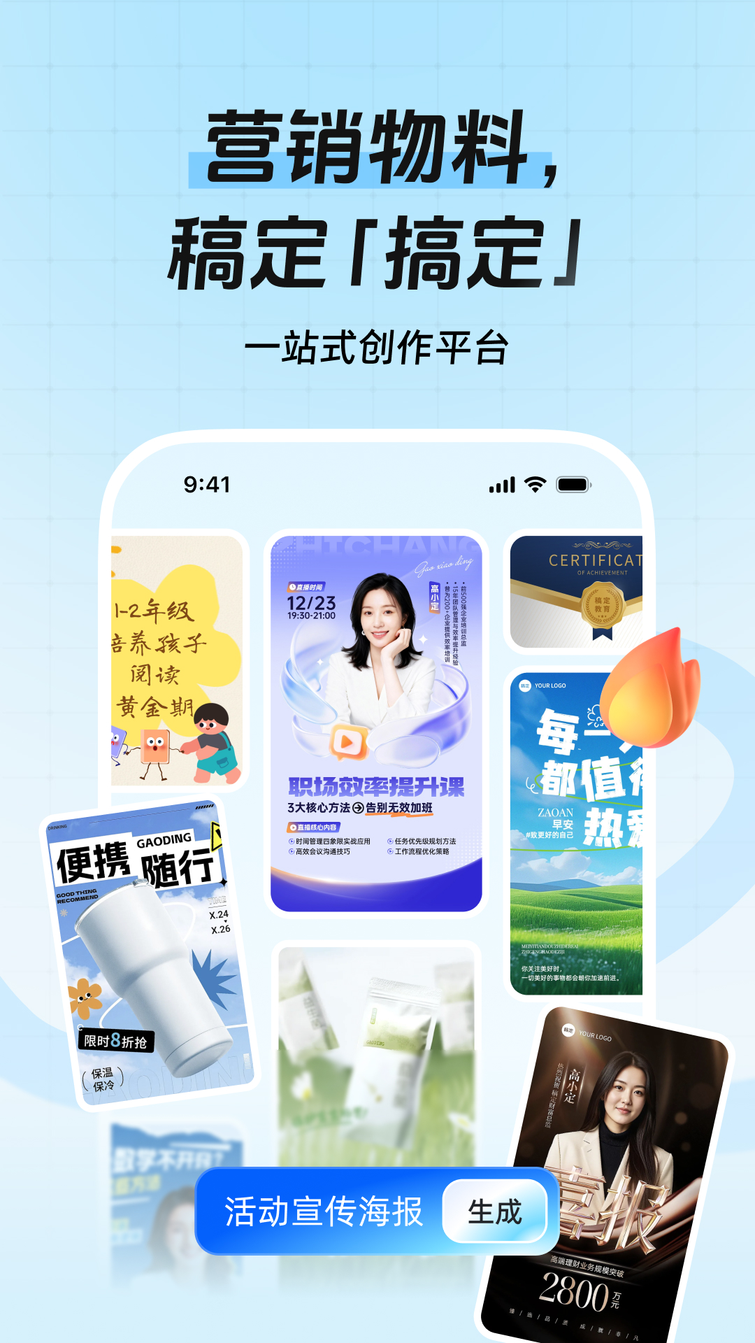 「稿定设计」全网累计下载超 4 亿人次!<br>全品类热点物料,30 万+ 图片视频模板,9000 万+ 可商用版权素材。<br>28+ 垂直行业,包含社媒配图、教培物料、商品套图……稿定帮你搞定全场景设计需求。<br><br>【 稿定「搞定」AI 创作,让效率更进一步 】<br><br>搞定形象照:AI 照片生成、换背景、智能美颜,轻松打造专业形象照。<br>搞定自媒体:爆款模板、文章配图、热点追踪、节日海报与宣传图。<br>搞定电商需求:制作商品套图、换场景,适配各电商平台,提升购买转化。<br>搞定教培物料:招生图、课程宣传图、讲师开课图,招生培训更高效。<br>搞定品牌宣传:Logo、名片、促销海报等,保持品牌一致性。<br>搞定 AI 修图:去水印、智能消除、高清修复、智能扩图等功能,快速提升画面质感。<br><br>【 稿定「搞定」海量模板,覆盖高频营销场景 】<br><br>海报制作:多图层编辑,无需 PS;改字换图即可出图。<br>图片编辑:智能裁剪、预设尺寸、新建画布、艺术字体等能力齐全。<br>拼图 / 拼视频:200+ 版式模板一键套用,拼接轻松又好看。<br><br>【 稿定「搞定」正版保障,所有内容放心商用 】<br><br>30 万+ 图片视频模板,9000 万+ 可商用版权素材,1000+ 正版字体、5000+ 正版音频。<br>原创保护:持续上新原创内容,用稿定,版权无忧、原创无忧、追热点无忧。<br>热点日历:节日与热点模板实时更新,让营销更快一步。<br><br>【 稿定「搞定」团队协作,支持多人高效共创 】<br><br>快速复用:团队共享模板、素材,成员一键复用。<br>团队空间:创意内容集中管理,提升协作效率与资产安全。<br>多端协作:电脑/手机均可使用,满足即时创作需求。