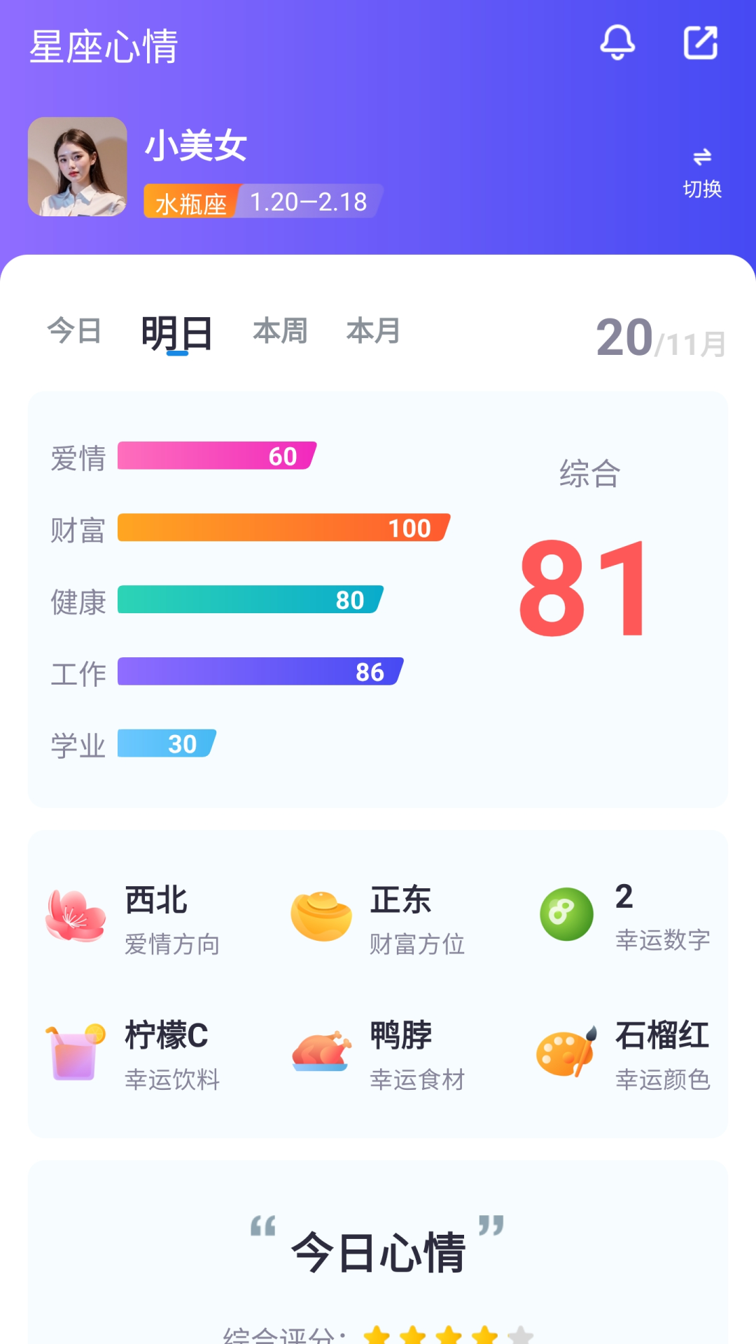 --星座特征:分析十二星座的性格、喜好、追求、绝配星座and死党星座。十二星座爱谁、适合跟谁做朋友,让每日星座运势来告诉你答案~<br>--不得了啦,每日星座运势app里还有明星运势、明星星盘!李宇春、陈伟霆、杨洋,爱豆的每日运势、星盘信息都在app里~<br>--星座运势:全面解析你的每日星座运势,帮你了解12星座的每日、每周、每月的运势变化,让你更加了解自己的爱情、健康、事业,随时掌握自己的运势并能时刻做好准备,从容地面对人生。每日星座运势包括桃花运、贵人运、出行运、情绪、事业运、牌运、健康、父母运、子女运等。<br>--星盘信息:根据出生日期、出生位置测算出你的星盘,帮你解读星盘的奥秘。<br>【行星信息】解读你的主要性格特征、情绪、情商、审美能力、行为方式、智慧和成就、思考方式、创造力等。<br>【宫位信息】解读你的上升星座、天顶星座等,包括你的个性、财运、欲望、家庭生活、冒险精神、健康、社交、精神生活、梦想等。<br>【相位信息】解读你的性情、生活态度、人际关系、想象力等。