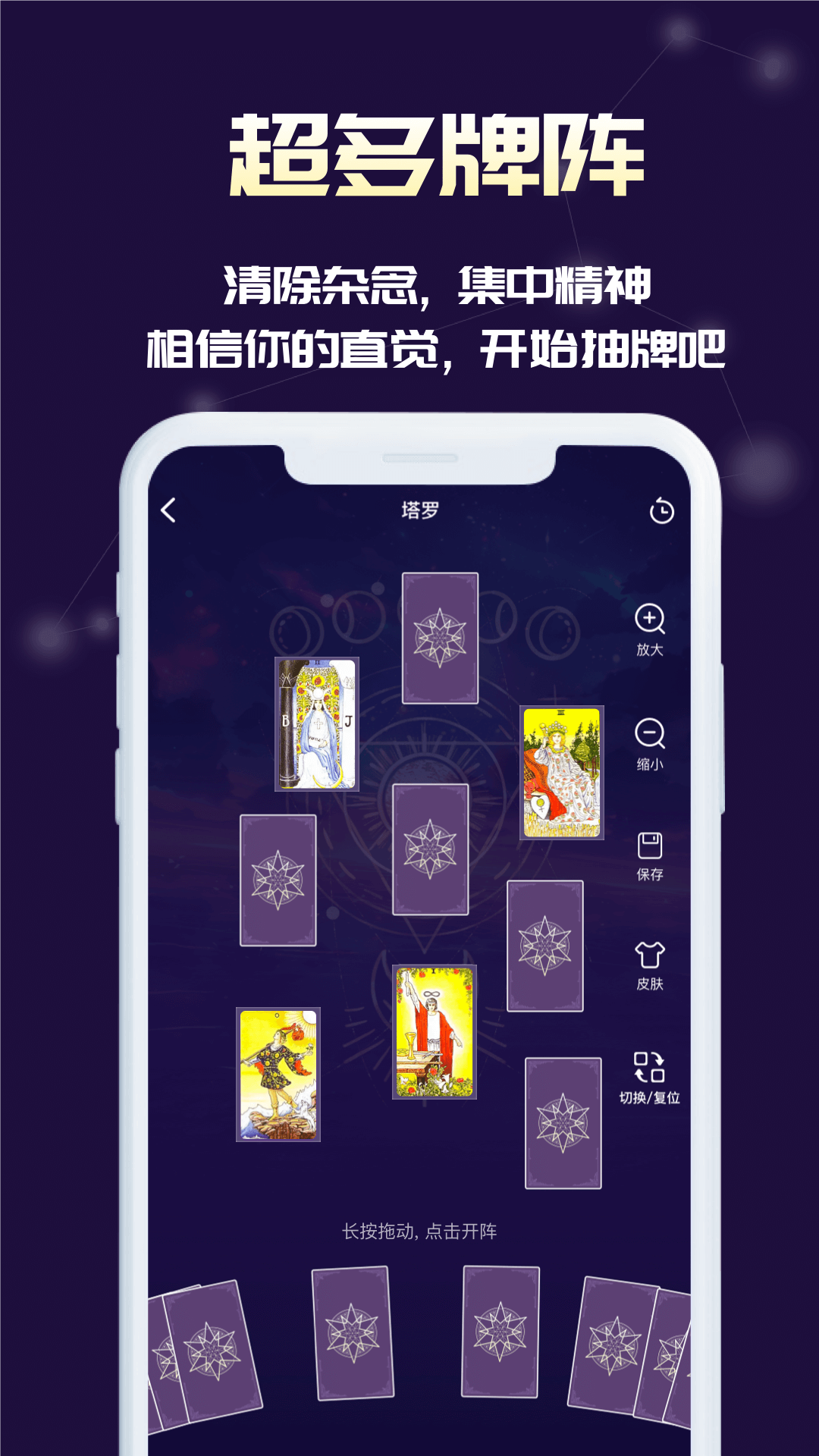 【塔罗牌】+【星座】+【答案之书】+【决策币】 <br>1、塔罗牌 Tarot 指尖塔罗--跟随手指滑动<br>(1) 78张塔罗牌的详细解析。利用22张大阿尔克纳牌,56张小阿尔克纳牌用于测测和占卜,知晓您在爱情,学习,婚姻,人际,事业,财运,健康,运程,综合的未来方向,让你更加了解您的过去,现在,未来。<br>(2)多种牌阵供你选择,包括圣三角、吉普赛十字、自定义牌阵。 跟随指尖滑动,自定义你需要的牌阵,附有别具一格的解析。 <br>(3)塔罗牌的科普知识提供了塔罗牌教学、塔罗测试。 <br>2、占星 <br>(1)星座运势:12星座每日运势、明日各项指数、本周指数、本月指数、年度报告。 <br>(2)占星骰子:探索宇宙与内心。 <br>(3)星座匹配:你跟那个星座匹配! <br>3、更多功能 <br>(1)决策币:你的决策指南。 <br>(2)答案之书:答案书帮你做选择,解决你选择困难症,还在纠结今天吃说明吗? <br>(3)心愿墙:心愿清单、新年计划。 <br>(4)励志语录: 得言每日一语。 <br>(5)更多功能: 意见反馈,定制你期望中的更多功能。