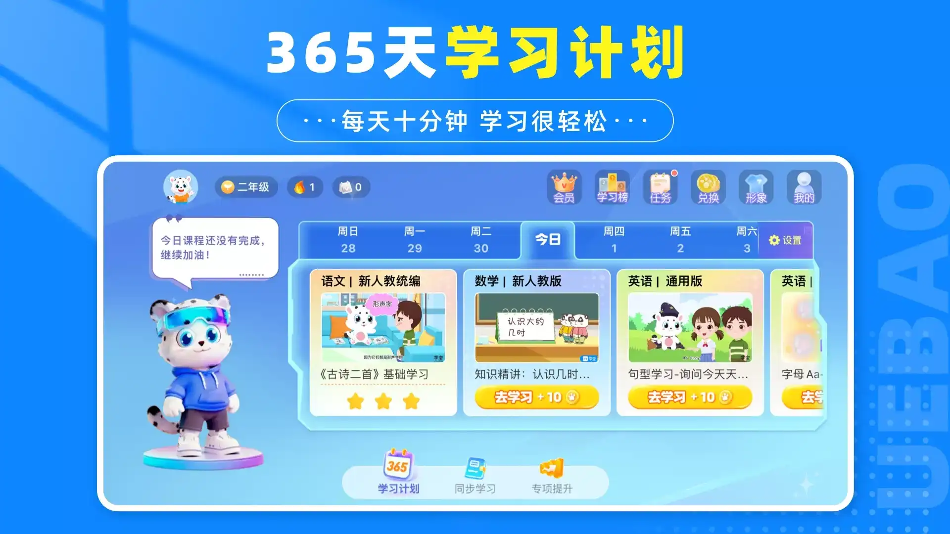 【小学宝简介】 小学宝是面向小学阶段学生,专注6-12岁小学生校内课后同步辅导自主学习的学习工具,提供小学语文、数学、英语教材配套的动画学习视频和学习资料,解决课内问题。 【产品优势】 1、2万个与课内教材课本内容同步的动画学习视频,全方位满足学生课前预习,课后练习,基础巩固的需要,还有海量练习题,帮助学生轻松应对考试; 2、视频内容以轻松、有趣的动画形式展现,让孩子爱学到根本停不下来; 3、配备AI拍照讲题、作业批改、识字、拼音、口算、听写、听课文等10多个与教材配套使用的专项辅助学习工具,随时随地协同练习更高效; 4、专注各阶段学习重点: 【1-2年级】养成学习习惯,培养学习兴趣,夯实学科基础 【3-4年级】抽象思维初步培养,同步学习,拓展提高 【5-6年级】系统化梳理,知识体系灵活应用,顺利过渡高年级 5、会员有专属的学习奖励体系 会员学习动画视频、做题、练字获得学币时,可以享受双倍学币奖励,让孩子更快的速度去获取学币兑换礼品。 每天同步学习,大量练习工具,持续更新,任您选择! 下载小学宝APP,语文、数学、英语课堂同步学,孩子成绩好,家长没烦恼! 客服热线:010-8239