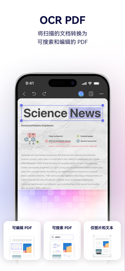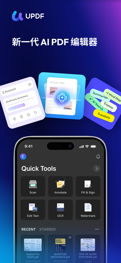 UPDF是一款AI Agent驱动的PDF编辑软件,1个账号付费,全平台都可以使用(电脑+手机+iPad)。 UPDF支持创建 PDF、注释PDF、编辑、AI、拍照扫描制成 PDF、文件安全保护、查看阅览各种文件格式(包含各类文档、音频、视频、文本、图片等)。 UPDF 支持丰富的文档管理操作,包括云同步、跨端传输、查看、分享、压缩、解压、加密保护等。它是提升办公学习效率,加强移动端文档管理的强大助手!以下是详细功能介绍: 一、编辑PDF 1、编辑正文:支持添加正文或编辑正文内容;支持通过扫描的方式添加文本; 2、编辑图片:支持添加或编辑图片;支持通过扫描的方式添加;支持对图片的旋转、提取、替换、删除、复制、粘贴 二、批注 PDF 文档和图片 支持在 PDF 和图片上添加高亮、下划线、波浪线、删除线、气泡注释、铅笔绘图、图形、箭头、文本、文本框,文本标注。 三、AI助手 1、总结、翻译、解释和改写 PDF 文档; 2、有两种方式使用 UPDF AI:通过聊天窗口或直接选中文字; 3、与 UPDF AI 聊天,并向它提出任何问题。 4. 支持AI 翻译与思维导图生成。 全新 AI 功能(AI Agents) - AI 书签助手(AI Bookmark Agent) 自动生成结构化书签,并提供段落摘要,快速掌握长文件重点(效率提升 92%) - AI 语义搜索(AI Semantic Search) 依“意思”搜索内容,而非单一关键词 输入一个概念,即可找到相关词与内容(如 Responsibility → Liability) - AI 编辑工具(AI Editing Suite) 直接在iPhone或iPad上的PDF编辑器中改写、调整语气或修正语法——无需复制粘贴,无需切换应用 三、 拍照扫描 1. 一键扫描创建成 PDF 文档; 2. 对扫描图片进行裁剪、旋转、删除、排序和加滤镜等操作; 四、 打开并查看各类文档 1. 支持打开浏览各类文档格式,包括 PDF、 Office格式(包含.doc, .docx, .ppt, .pptx, .xls, .xlsx),Pages文稿, Keynotes讲演和Numbers表格; 2. 支持打开zip包; 3. 支持打开文本txt,HTML(.html, .htm, .xhtml), XML, Web Archive, 图片(JPG, JPEG, GIF, PNG, TIFF, SVG, BMP), 音频和视频格式; 4. 书签:使用书签链接跳至文档中的特定位置。 五、 批注 PDF 文档和图片 支持在 PDF 和图片上添加高亮、下划线、波浪线、删除线、气泡注释、铅笔绘图、图形、箭头、文本、文本框,文本标注。 六、签署 PDF 文档或者图片 支持在 PDF 或者图片文件上添加和管理手写签名 七、组织页面 1. 在PDF中插入、替换、提取、拆分、旋转、删除和重新排序页面 2. 将多个PDF合并为一个文件 3. 复制、粘贴和分享PDF中的特定页面 八、创建 PDF 1. 创建包含空白、线条、点线、网格和图表的PDF 2. 支持合并多个图片或者多个 PDF 为一个PDF; 九、 压缩文档 支持将多个文档压缩为 Zip文档; 十、 文件管理 1. 支持上传、创建、重命名、移动、复制、创建副本和文档排序; 2. 解压 Zip 文档; 3. 搜索查找文档; 4. 支持两指触控进行多选; 5. 支持移动文档到回收站,以及从回收站恢复的操作; 6. 支持给 PDF 文档添加访问密码,或者给加密文档解除密码; 十一、 导入文档 1. 支持从相册导入图片、视频; 2. 支持从“文件” App导入各类文件; 3. 支持通过 WiFi 传输在手机和电脑间无线传输文件(两设备需在同一WiFi环境下); 十二、 安全管理 1. 支持将文档放置到安全空间,并添加访问密码(指纹解锁或者人脸识别); 2. 支持给UPDF应用添加访问权限密码(数字密码解锁或者人脸/指纹识别)。 应用内购包含的功能 - 购买后可以在桌面端和移动端使用UPDF。查看不同平台上的功能差异:https://www.updf.cn/tech-spec/ - 在桌面端有PDF文本编辑、批注、PDF格式转换、OCR等高级功能。 - 扫描制成 PDF (免费试用版仅支持扫描5页) - 无限使用安全空间 (免费试用版仅能添加10个文件到安全空间) - 给应用锁设置密码或者人脸/指纹识别 如果您对此应用有任何疑问或者需要任何帮助,请发送电子邮件至 support@superace.com,我们将积极为您解答。 如果您觉得这款应用对您有所帮助,请在 App Store 中给我们一个好评, 非常感激!