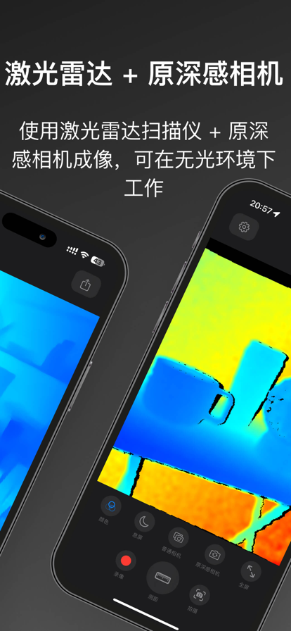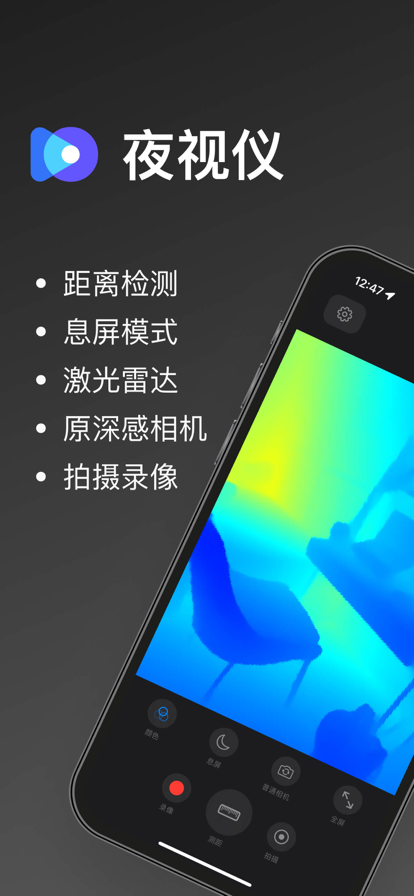 夜视仪是一款能在完全黑暗环境中拍摄和录像的 App,充分利用 iPhone 和 iPad 的激光雷达扫描仪与原深感摄像头技术。与其他夜视 App 不同,它借助设备内置的深度传感器扫描周围环境,生成真实的夜视画面,远超普通相机滤镜的模拟效果。 【功能介绍】 - 多摄像头切换:自由切换激光雷达、TrueDepth 传感器和普通摄像头,满足不同场景需求 - 拍摄录制:可拍摄 "激光雷达图像"和录制"激光雷达视频",并保存到系统相册 - 距离测量:实时测量目标与设备之间的距离,探索空间深度 - 实时推送:实时推送夜视画面到 Apple Watch、手机、平板和电脑,随时随地查看精彩瞬间。 【原理】 在光照充足环境下同时使用后置普通摄像头和激光雷达扫描仪/原深感相机联合成像,以保证图像质量;在完全无光环境下只使用后置激光雷达扫描仪/原深感相机成像。 【支持的设备】 所有配备了激光雷达扫描仪或具有 Face ID 功能的 iPhone 和 iPad。 【自动订阅服务说明】 订阅后可解锁全部付费功能,并持续获得后续高级功能更新。 确认购买后,订阅会通过你的 Apple 账号自动续订。到期前 24 小时内将自动扣费,成功扣费后订阅将延长一个周期。如需取消自动续订,请在当前订阅到期前至少 24 小时,于 Apple ID 设置中手动关闭自动续费。是否取消续订由你自行决定,未取消即视为同意进入下一计费周期。 隐私政策:https://night-vision-web.netlify.app/en-us/privacy-policy 使用条款:https://www.apple.com/legal/internet-services/itunes/dev/stdeula 【联系我们】 邮箱:darkce97@gmail.com