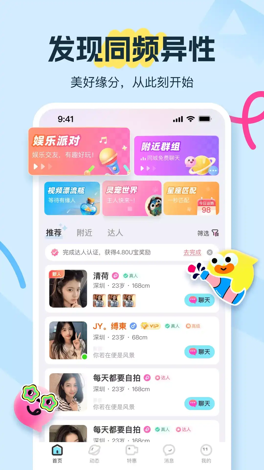 友趣是一款以真人实时视频为核心,融合多元娱乐场景的综合娱乐社交平台,为你带来全新的社交体验。在这里,每一次互动都充满温度与惊喜,让你在虚拟世界中也能感受到真实的连接与快乐。 【真人视频】真人高清实时视频连线,身临其境般的畅聊体验,情感传递更直接,距离不再是阻碍; 【灵宠世界】软萌灵宠随时互动,为社交时光增添一份治愈暖意,开心或失落,都有贴心伙伴; 【群聊社区】精心打造多元社群,体验活力四射的线上聚会,让每一份兴趣都能找到共鸣; 【智能推荐】智慧推荐就像懂你的挚友,多维度为您精准匹配,跳过无效寻觅,高效连接缘分; 【达人陪伴】各类才艺达人在线,歌声传情、舞影流光、段子逗乐,多样视听乐趣,让互动精彩不断。
