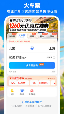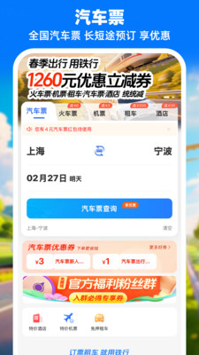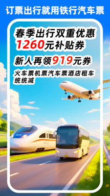 汽车票、机票、火车票、租车、酒店、门票一站式出行预订平台;来就送919元新人优惠大礼包,租车可返现~ 【新客大礼】铁行汽车票APP的新用户可自动领取一份919元的新客优惠大礼包,内含汽车票、机票、火车票、租车、酒店、专车等立减专享红包,先领券再下单更划算,更省钱,可在优惠券中心查看并使用。 【汽车票】全国汽车票在线预订,出票快,享优惠,退改方便,随时随订,即刻出发,支持线下车站取票。 【特价机票】特价机票天天有,更享机票折扣优惠,往返特惠双重叠加,价格透明,单单立减,线上退改签方便快捷,省心订。 【免押租车】可返现金,租车押金双免,送取车上门,覆盖500+城市,10000+车型可选,更享抵扣优惠及800元新人礼包,超划算,更省钱! 【火车票】在线购票方便快捷,支持在线抢票、在线选座、在线选铺,余票监控,候补购票,智能推荐您的出行方式。 【酒店】全国酒店在线预订,钟点房、品牌酒店、民宿等应有尽有,更享优惠补贴; 【24小时客服】7x24小时在线客服服务,随时解决您所遇到的问题,为您的出行保驾护航~ 【出行助手】火车正晚点,航班动态查询,在线值机,车站大屏,高铁订餐; 特价机票火车票汽车票7*24小时预订;航班动态,火车正晚点,机票在线值机,专车接送机(延误免费等) 订汽车票就上铁行汽车票,超划算 让您的出行更舒适、更便捷,开启新的旅程~