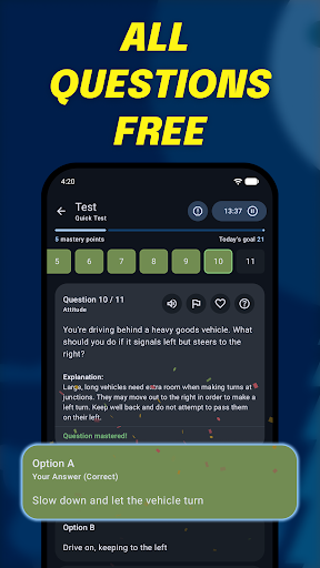 2024 年驾驶理论考试的免费版本允许您练习<b>所有复习题、答案、解释</b>,由 DVSA(考试设置者)授权<b><u>免费</u>< /b>.<br><br><b>每位英国汽车驾驶员学习者应该<u>立即下载此应用程序的十大理由</u></b><br><b>1.最新的</b> - 所有修订材料在 2023 年和 2024 年均有效。<br><b>2.模拟测试</b> - 参加无限量的模拟测试,就像实际的 DVSA 考试一样。<br><b>3. DVSA 问题</b> - 练习 DVSA 复习问题。<br><b>4. DVSA 解释</b> - 每个练习题都包含 DVSA 答案的解释,提高您准备的效率。<br><b>5.标记问题</b> - 在精心设计的用户界面上标记最难的问题,以便稍后再次复习(例如,考试前 30 分钟)。<br><b>6.私人教练</b> - 您自己的助理会深思熟虑地发现您最需要学习的问题并首先提出它们。练习汽车理论考试从未如此简单!<br><b>7.超级灵活</b> - 英国驾驶理论考试 2024 具有强大且易于使用的设置,使每个人都能轻松练习驾驶执照考试。<br><b>8.离线工作</b> - 随时随地练习汽车理论考试。<br><b>9. 《公路法规》</b> - 2024 年英国驾驶理论考试包含指向我们独立《公路法规》应用程序的链接。它完全免费,包含 DVSA 许可的所有最新修订工具。<br><b>10。购买前先试用</b> - 这款免费应用程序附带 2 个已解锁的主题,让您可以在购买完整版本之前对其进行评估。<br> <br>别想了。别奇怪。只需尝试 2024 年英国驾驶理论考试的免费版本即可!<br> <br>皇家版权材料经驾驶员和车辆标准局 (DVSA) 许可复制,该局对复制的准确性不承担任何责任。<br> <br>____________________________________<br>该应用程序适合所有英国汽车驾驶员学习者。</b>