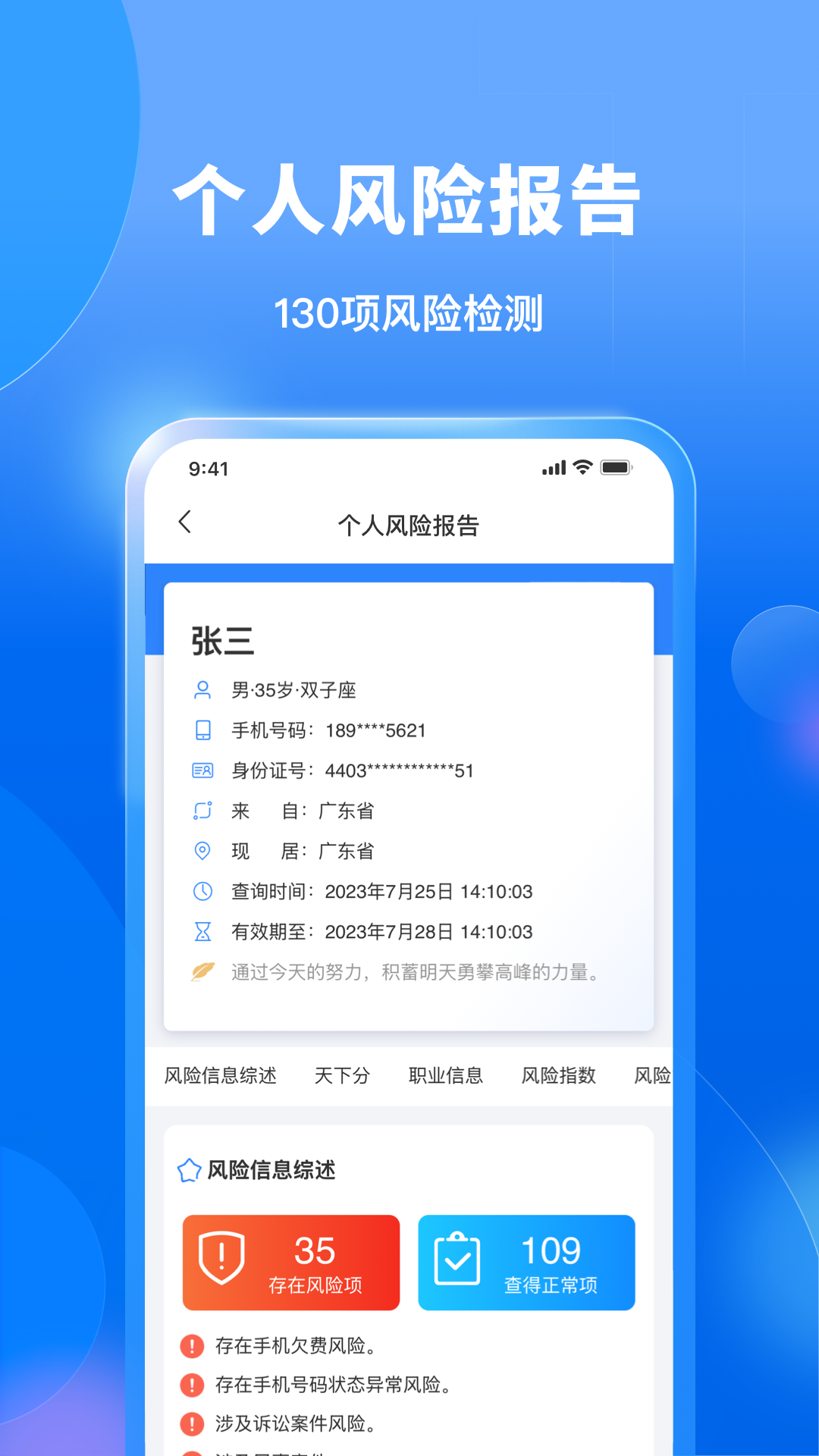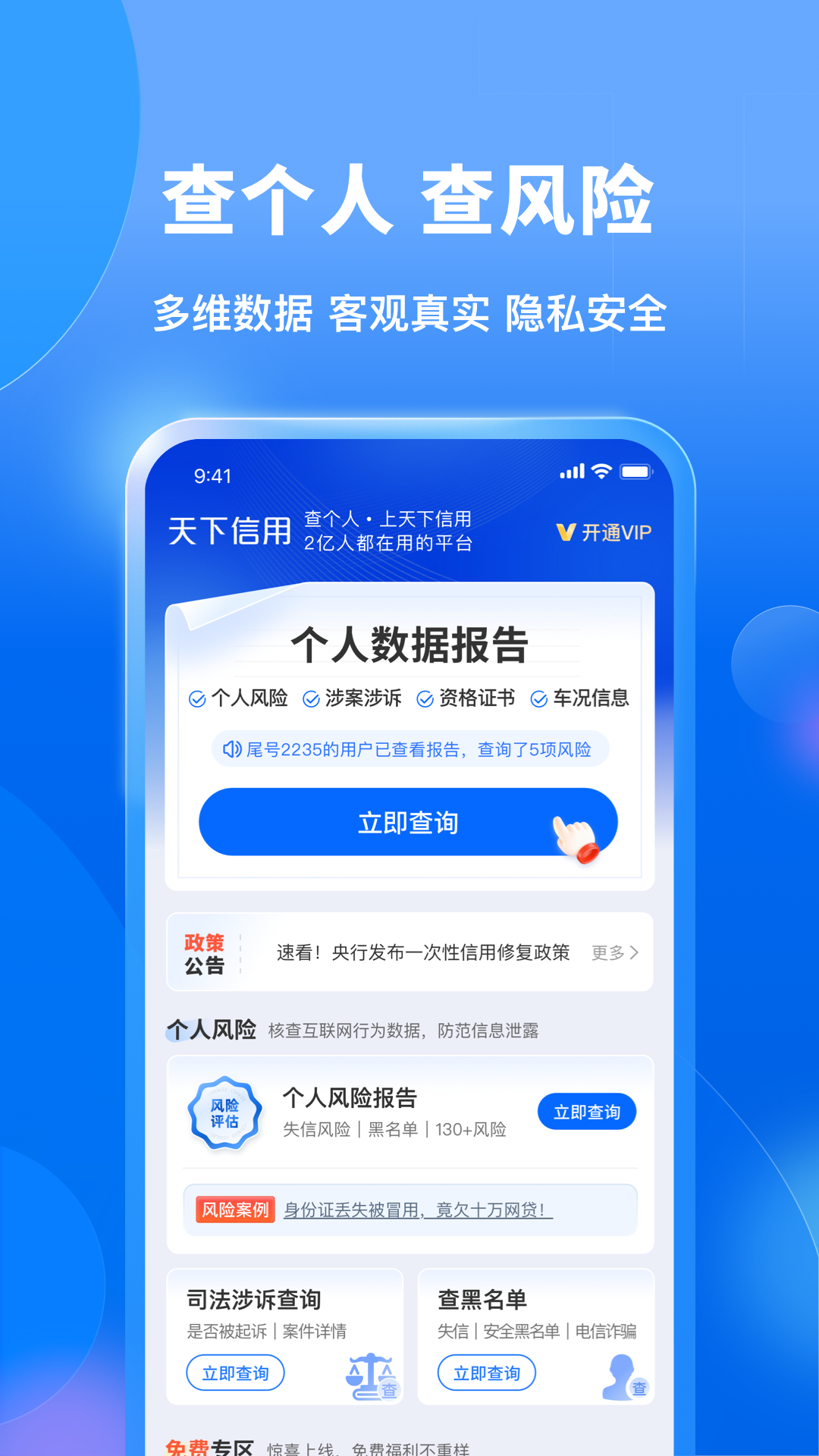 天下信用,2亿人都在用的风险管理工具,能查个人,更能查企业的双功能APP。<br>一、主要功能<br>1、查个人,可查财富、查风险、查老板、查老赖、查证书。<br>2、查企业,可查公司、查电话、查商标、查专利、查风险、查处罚。<br><br>二、产品简介<br>【查个人】<br>1、个人风险查询<br>全方位检测130多项个人风险,提供风险自动监控服务,随时随地帮你监控和预防各种风险。主查:失信风险、行政处罚,同时还检测个人身份被冒用、被失信、被黑名单、被执行等各种风险,保护个人财产安全,避免风险损失。<br>2、个人财富查询<br>一键查询个人名下资产,股权、车辆、单位、从业资格证书,全面展示个人赚钱能力。<br>3、个人资格证书查询<br>一键查询各种资格证书、职业技能等级证书。一网查尽,全国通用,强烈推荐热门高薪证书,助力就业、升职、加薪。涵盖技能类、计算机、金融、会计等10大类1000+种证书。多场景均适用,提升就业成功率,升学留学,户籍转入,职称评级,人事任免,提升竞争力,提高赚钱能力。<br>【查公司】<br>可查基本信息、地址电话、股东高管、实际控制人、对外投资、商标专利、各种风险、行政处罚等。<br>【查老板】<br>可查老板名下公司、股东构成、对外投资、各种风险、行政处罚等。<br>【查电话】<br>可通过输入企业名称,快速检索目标企业电话及其他联系方式。<br>【查老赖】<br>只要输入个人名字,可立即知道对方是否是老赖,保护自己,防止被骗。<br>【查商标】<br>查专利,可查企业商标、专利情况。<br>【查风险】<br>可查企业自身风险,合作伙伴风险、行业风险,提供企业风险自动预警服务。<br>【查处罚】<br>可查失信、被执行、法院公告、裁判文书、开庭公告、经营异常、行政处罚、严重违法、抽查检验、动产抵押、清算信息、欠税处罚等。<br><br>三、安全合规<br>1、采用多重认证方式,确保用户本人查询不被他人盗用。<br>2、采取多重保密措施,严格遵守法律法规,确保用户查询信息不被泄露。<br>3、采用多方位数据来源,全面展示个人和企业全貌。<br><br>查个人风险,上天下信用!<br><br>四、联系我们<br>海南凤凰木科技有限公司<br>官方网站:https://www.txxy.com/<br>官方微信:微信公众号搜索“天下服务“<br>客服电话:400-612-1133