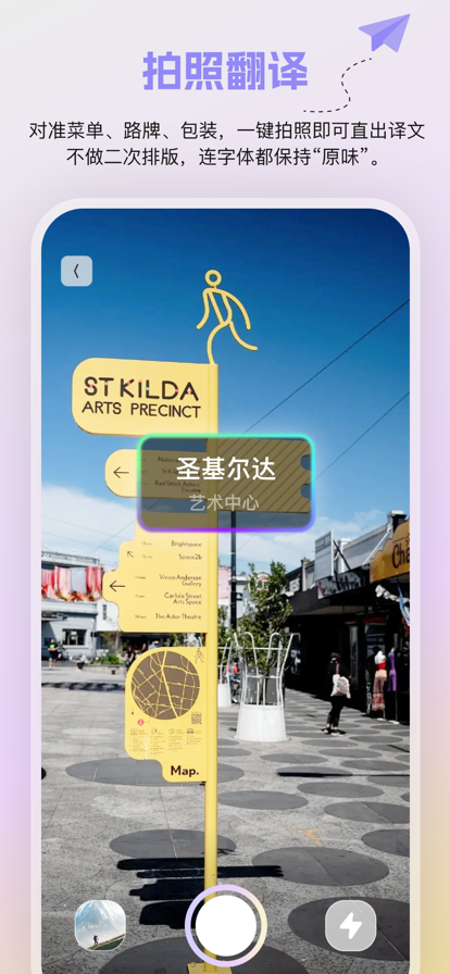 拍照翻译是一款小巧实用的翻译工具,支持多种语言翻译,您只需要使用相机对着书籍、报纸、文档等进行拍照,即可进行拍图识别、智能高清扫描、精准识别、极速翻译,取字/翻译结果一键朗读。 【功能说明】 拍照翻译:对着文字进行拍照即可获取优质翻译 翻译语种:支持多种语言,覆盖多个国家,英语翻译、出国翻译、旅行翻译、旅游购物都不用担心; 文字识别:快速识别图片中的文字,极大提高您的输入效率,准确率高达99%!还能智能分段哦! 即时翻译:强大的OCR摄像头取词和拍照翻译功能,一拍即译,无需手动输入 图片模式:选择已储存的图片,识别图片中的文字后翻译到需要的语言 结果编辑:翻译图片后,可以对识别翻译内容进行保存复制 【联系我们】 拍照翻译官,期待您反馈使用过程中遇到的问题,同时给我们提出产品改进的建议,联系邮箱:support@kuntapp.com