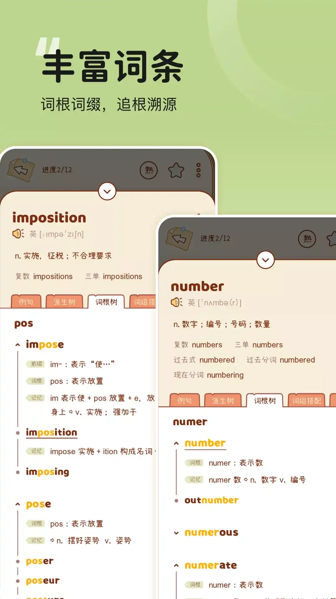 不背单词是一款真实语境学单词神器。 这里有专为英语考试定制的一站式解决方案。在海量有声例句创造的真实语境中,词义和用法被精准呈现,智能记忆算法,让你真正科学高效地掌握单词。 「 高效刷词备考,我有 4 大法宝 」 - 考义:真题考义加粗标注,记忆有重点 - 考点:单词 & 真题词组配套学,一次学习,双重回报 - 考频:单词考频一看便知,合理分配学习时间 - 考题:随时查看真题例句,实战演练考试不慌 「 真实语境记单词 」 - 150万+ 条原声例句,出自你喜欢的剧集、电影等真实语境 - 地道词组搭配,解读词义、体现用法,打造“最小语境” 「 丰富的学习内容 」 - 2000+词根词缀,覆盖近 2 万词条,追根溯源深入解析 - 5500+派生词汇树,以熟词记生词,加深理解高效记忆 - 柯林斯双解词典,豆瓣评分 9.7 的学习型词典 「 全面的单词词书库 」 - 小学/初中/高中/四级/六级/考研/托福/雅思/专四/专八/专升本/日常生活/商业法律/人文社科/朗文/COCA/BEC/GRE/SAT/GMAT/MBA/托业等权威词书任你挑选 「 巩固记忆有绝招 」 - 独特拼写测试,学完一组动手拼写强化记忆 - 记忆算法智能安排学习,在遗忘临界点提醒复习 - 单词随身听记,高效利用碎片时间 「 拯救学习拖延症 」 - 签到学习送大把酷币,背单词不犯拖延症 - 不定期组队打卡活动,充分调动学习积极性 「 我们还有什么? 」 - UI 简洁 ,操作简易,专注学习,不受打扰 - 客串壁纸App,每次学习都有惊喜 - 主题明亮/深邃/极夜三种可选,支持跟随日出日落切换 「 不背成绩单 」 - 50000+五星好评 - App Store 首页通栏推荐 - 金米奖 - 至美奖 - 小红花奖 - 设计奖 「 不背成长关爱热线 」 - 微信公众号:搜索「不背单词App」 - 官方 QQ 交流群:758465732 - 新浪微博:@不背单词App - 不背单词应用内:设置-帮助中心