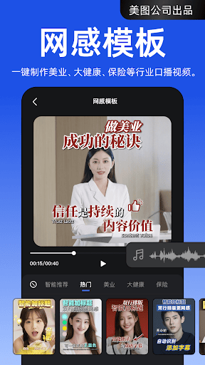 开拍App - 用AI制作网感口播视频<br>开拍是美图公司在2023年推出的一款用AI制作网感口播视频的生产力工具。通过AI帮你写,AI帮你拍,AI帮你剪,帮助创作者0基础1分钟制作有网感的口播视频,让自媒体起号更简单!<br><br>核心亮点:<br>===一键网感剪辑!自媒体人的随身剪辑师===<br><br>【文字快剪】免费加字幕,支持10+种方言识别、一键去水词、一键生成双语字幕,对着文字剪视频,视频初剪更快更简单。<br>【网感模板】AI智能匹配贴纸花字、音乐音效等素材,提供60+多风格多行业剪辑模板,一键剪出网感满满的口播视频。<br>【动态字幕】字幕动起来,视频更带感!上百款字幕模板任你挑选,一键剪出专业剪辑师都在做的字幕效果。<br>【AI片头】一键包装视频精华内容、一键生成创意开场动画,两种开头都吸睛,3秒抓住开场流量。<br>【AI封面】智能识别关键帧,结合平台调性,一键生成爆款封面,让你的视频点击率飙升!<br><br><br>===美业、大健康、保险财经、实体商家等<br>行业口播视频提效神器,简单高效做短视频营销!===<br><br>*行业专属网感模板,每天1分钟,甩开90%同行!<br>【网感模板】一键剪出行业头部IP同款视频,每天1分钟,轻松实现日更,稳稳拓宽客源。<br><br>*行业专属脚本,AI帮你快速出稿,文案吸客不费脑!<br>【AI脚本】接入DeepSeek R1推理模型,提供行业专属脚本,<br>输入关键词,即可一键生成爆款文案。还有保险、美业、健康养生、教培等行业灵感库,让你不再头疼选题。<br>【文案提取】告别手打字,一键提取视频/图片/链接中的文案并创建脚本。<br><br>*行业口播必备,多款神器,帮你解决出镜难题!<br>【提词器】[AI语速]模式,助你拿捏提词节奏,告别生硬读稿,口播流畅又自然。<br>【高清相机】支持4K视频录制,画质超清,看着专业!支持滤镜、美颜调节,上镜好看!<br>【数字人】太忙没时间录口播?定制个数字人,让数字人替你24h出镜营业,轻松实现日更自由。<br>【AI对口型】读错稿不想重新拍?AI一键改口型,让旧视频说新台词。<br><br><br>其他功能:<br>===开拍AI黑科技全家桶===<br>【AI消除】你的视频电子橡皮擦,支持消文字、消标记,连满屏乱飞的游走文字也能一键消除,还你干净“原”视频。<br>【画质修复】AI超清修复,渣糊画质秒变清晰,图片视频都能修。<br>【一键成片】接入DeepSeek超能力,不用拍不用剪,会打字就能一键生成视频!<br>【裁剪·扩展】AI扩视频,智能补画面,轻松实现构图自由。<br>【声音克隆】免费克隆你的音色,一键实现配音自由。<br>【视频降噪】AI超强降噪,还原立体人声,录视频再也不怕环境嘈杂了!<br>【视频翻译】智能翻译,一键生成多语种的双语字幕;一键改口型,AI帮你轻松说外语,让全世界看懂你的视频!<br>【视频美容】医美级美颜参数自由调节,效果自然不假面,素颜也超上镜。<br>【智能抠像】一键抠人像,自由换背景加描边,再也不必担心拍摄场景杂乱。