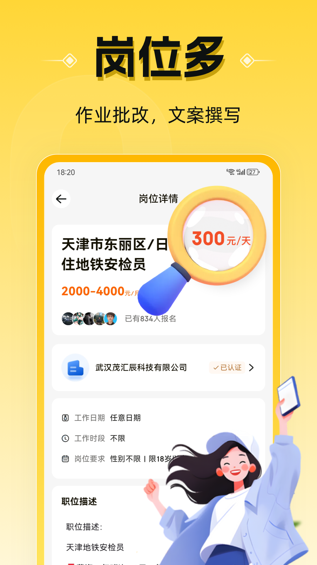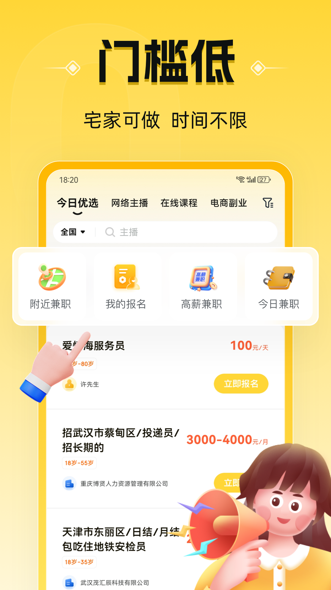 须知:根据相关法律要求,本平台不为18岁以下未成年人提供就业服务。<br>【适应人群】 18-40岁人群 涵盖上班族、宝妈宝爸、白领、待业者、在校大学生等有一些空余时间的人群。<br>【海量职位】<br>近百种线上线下兼职岗位,平台认证审核。让您每次都有不同的兼职体验。无论是补贴零花还是技能提升都会对您充满帮助。<br>【平台保障】我们是国内率先推出薪资“预支付托管”模式的平台,所有发布招聘的企业都有招聘保证金放在平台。纠纷时优先保证金赔付,保障劳动者的薪资权益。所有岗位信息5重审核,确保岗位真实、优质,有效。2024年9月,平台联合支付宝蚂蚁保推出“灵活用工意外险(电信防诈版)”为求职者提供最高赔付12万元的求职保障。<br>【岗位服务】主推薪资日结岗位,保证薪资发放及时。覆盖7个大类近百种岗位,主要包括本地附近职位、线上主播类职位、代理销售类职位和技能副业类职位。<br>【客服响应】专业客服团队365*16小时在线处理您在兼职过程中出现的任何问题,24小时内极速处理。帮您解决所有问题。给您优质的就业体验。<br>【技能副业】为满足用户长期副业需求,平台联合头部机构推出唱歌游戏主播、网店就业、Python编程、JAVA编程、配音播音、插画创作、自媒体、等十几种技能副业岗位,人均月薪资达6K。