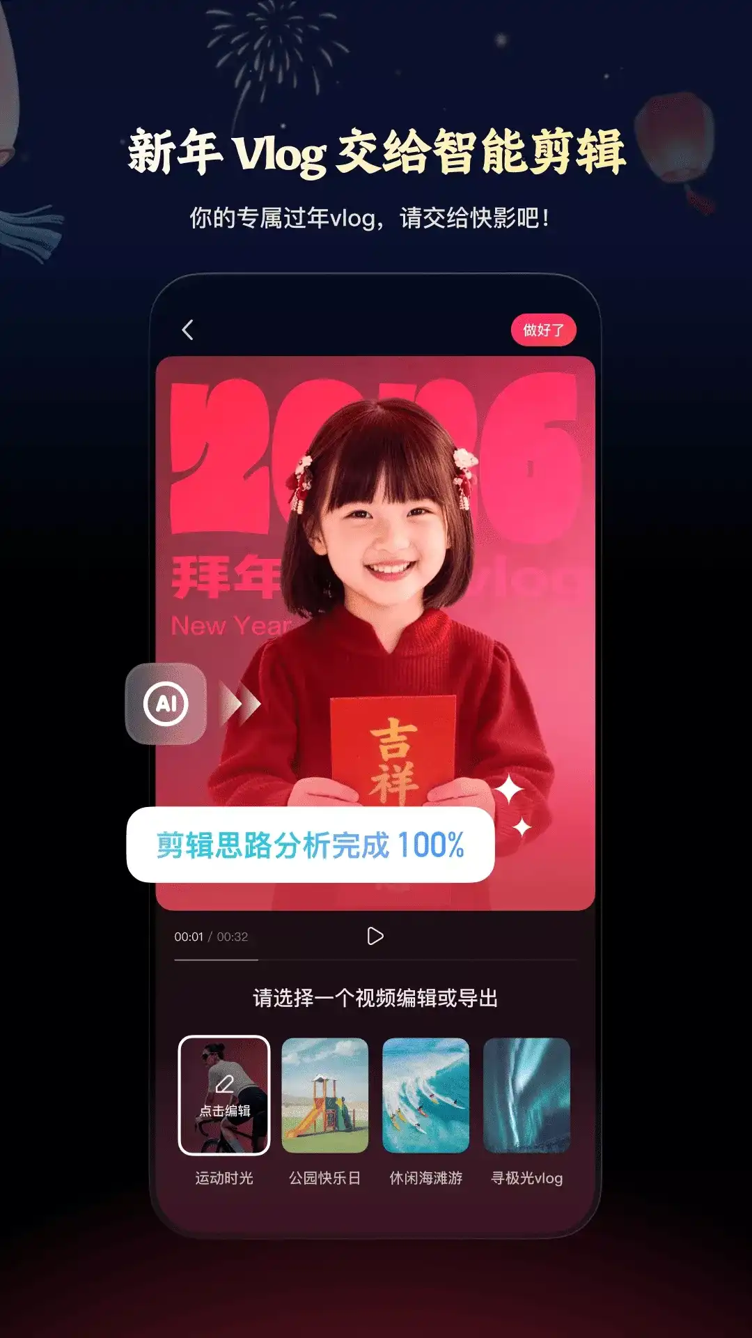 快影是一款专业简单易上手的视频剪辑应用,提供了丰富实用的功能,帮助用户轻松制作出高质量的视频作品。 亮点介绍: 【AI文案成片】:DeepSeek R1满血版免费用!提供视频文案撰写,文案改写润色功能;支持从文案直接生成视频,快速打造爆款内容 【AI视频动漫】上传人物视频,智能生成动漫效果;打造专属虚拟形象 【AI文生图】:输入描述词,选择图片风格,AI即可生成想要的图片 【AI绘画】:上传初始图片,选择风格玩法,AI即可生成新的效果图,支持为效果图增加关键词描述 【创作中心】协助解决运营账号痛点,为创作者推荐源源不断的创作灵感,破解粉丝偏好,助推实现账号涨粉 【强大素材库】贴纸、滤镜、画面特效、热梗… 海量素材紧跟流行趋势,网感素材一键UP 功能说明: 多种视频剪辑功能,包括视频分割、裁剪、拼接、倒放、添加常规/曲线/自定义变速、转场、添加封面和片尾等,帮助用户快速完成视频剪辑。 丰富的音效和音乐库,包括文字智能配音、语音加字幕、提取音频、降噪模式、音乐卡点等,让用户轻松添加各种音效和音乐,让视频更加生动有趣。 多种字幕选择和滤镜、美颜、视频背景、画中画、智能抠像等功能,让用户可以轻松制作出更加精美的视频作品。 海量模板涵盖多用户群体的风格选择,一键剪出同款火爆网络的短视频,助推作品上热门。