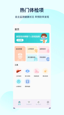 这款软件可以帮您轻松快捷的测血压、测心率、测血氧等,还能帮你解读体检报告,以及为您提供相关的指导建议。 【测血压/心率/血氧】简单好用的测量工具,轻松测出您的健康数值。操作简单,帮你更快的了解自己的身体状态变化。 【测肺活量/呼吸频率】足不出户就可以测量出你的肺活量和呼吸频率,得出结果快人一步。 【常规体现项目】包含了各类体检知识科普,体检常识、注意事项、临床意义等,血压、血脂、血糖、心率、血氧等常规监测,乙肝、视力、色盲、散光、心理测试、肥胖指数等。 【胎儿/儿童身高体重监测】记录胎儿或儿童每个时间段的维度/身高/体重等数据,帮助新手爸妈管理孩子健康。