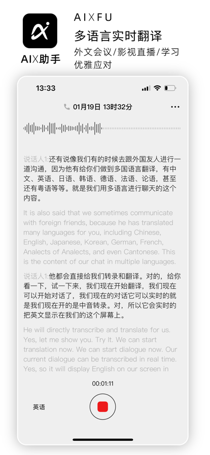 AIx助手可以帮您快速上手使用AI耳机,享受AI带来的快乐。 支持品牌:AIxFU(爱富)-阿里通义首款AI录音耳机 通过AIx助手,您可以进行如下功能操作: 通话录音:可以对电话、钉钉、微信等软件的通话进行录音 录音转文字:可以把通话的内容转写成文字,区分不同的说话人 实时翻译:可以实时翻译成多种语言 英语、日语、韩语、德语、法语 概要总结:可以对内容进行概要总结 AI问答:可以AI学习你的通话内容,变身你的个人小助理,进行对话问答 现场录音:可以对你周边的环境录音,像在会议室开会,咖啡厅谈事情,会后不用再做内容整理。 音视频录音:可以录制转写你手机上正在观看的视频内容,或者正在收听的音乐。 同声传译:支持中外互译,对方说外语耳机就能听到中文、跨语言交流,线下面谈,都能轻松搞定。 醇厚音效体验:内置音效调节,可供自由切换。您还可以个性化调整均衡器,自在畅享听觉盛宴。 按键自定义:随时定制触控按键功能,实现按键操作切换。 设备连接切换:可以在应用程序控制一部耳机同时连接两台蓝牙设备,还可以随时切换控制不同耳机设备。 播放控制:可以在应用上调节音量、暂停/播放、切换歌曲、播放模式。 获取耳机信息:包括耳机电量、用户手册、SN序列号等。 OS升级:实时更新耳机OS,持续优化耳机功能,提升您的使用体验。 如需帮助或获取更多信息: 可邮件联系:info@aixfu.com 微信公众号:AIxFU爱富