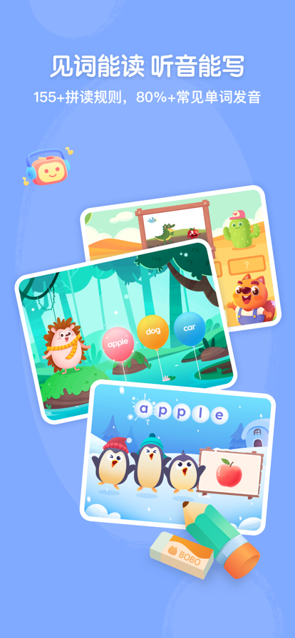 步步英语自然拼读,遵循3~10岁孩子认知和语言发展规律,通过科学的体系化内容,融合趣味游戏化互动方式及先进的AI技术,带孩子系统掌握“见词能读、听音能写”自然拼读基本规则,培养孩子的自主阅读能力。 产品特色 1. 趣味互动,高效学拼读 精心设计100+游戏化互动方式,让孩子完全沉浸其中,告别死记硬背,调动孩子的积极性,激发对英语的兴趣。 2. 见词能读,听音能写 内容涵盖150+拼读规则,80%以上常见单词发音,带孩子掌握“见词能读、听音能写”的自然拼读规则,培养孩子的自主阅读能力。 3. 智能报告,记录孩子的英语进步 智能大数据报告,第一时间同步孩子的每次使用表现。可视化报告呈现,让学习成果一目了然,见证孩子的英语学习成长与进步。 • 会员服务协议:https://www.bubuabc.com/app/u/VIPMembers.html • 用户协议:https://www.bubuabc.com/app/u/userProtocol.html • 隐私协议:https://www.bubuabc.com/app/u/privacy.html • 儿童隐私政策:https://www.bubuabc.com/app/u/kids_privacy.html 【联系我们】 微信服务号:步步自然拼读 客服热线:400-827-9800