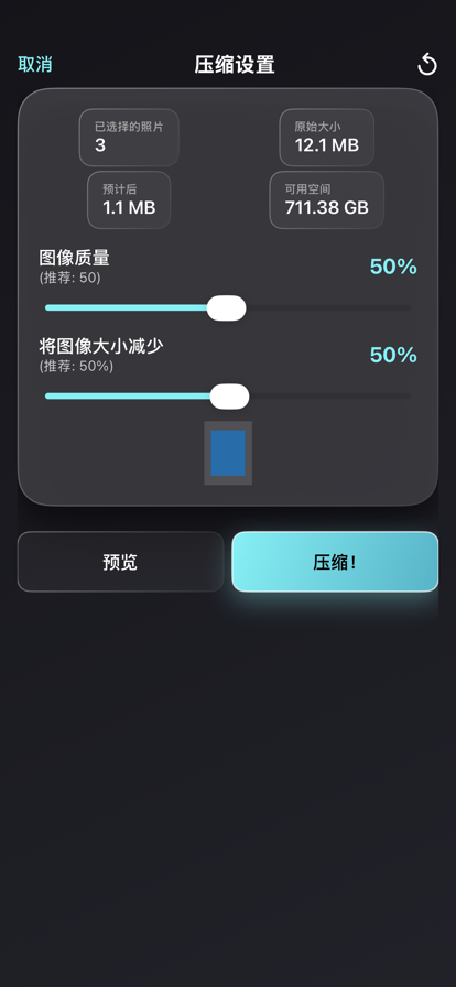 轻松缩小图片、压缩照片,节省 iOS(iPhone/iPad)存储空间。现在免费下载! 适用于: - iPhone/iPad 存储空间快满时,快速释放空间 - 批量压缩照片,减小文件大小,分享/发送更快(微信/短信等) - 将 HEIC/HEIF 转换为 JPEG,兼容性更好 概述: - 压缩单张照片、多张照片或整个相册(批量压缩) - 自定义 JPG/JPEG 压缩强度 - 自定义缩小图片尺寸(可选) - 无需调整尺寸也可压缩 - 预览查看图片质量 - 显示压缩前后照片占用的存储空间 - 简单易用,直观上手 - 支持将 HEIC/HEIF 照片转换为 JPEG - 可选:自动删除原始照片,仅保留压缩后的版本。请注意:已删除的照片仍可能出现在“最近删除”相册中。要真正节省存储空间,也请在“最近删除”中一并删除。 Standard Apple Terms of Use (EULA): https://www.apple.com/legal/internet-services/itunes/dev/stdeula/