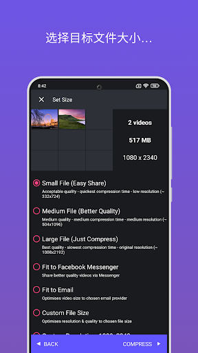 <b>支持的视频格式<br><br>MP4,MKV,AVI,3GP,FLV,MTS,MPEG,MPG,WMV,M4V,MOV,VOB<br><br><b>主要功能<br><br>by通过保持原始质量来压缩未压缩的视频。<br><br>from从具有不同质量和尺寸设置的预定义多个压缩配置文件中进行选择。<br><br>🎬将视频压缩为手动输入的大小。<br><br>🎬在压缩过程开始之前,显示所选压缩设置的短时间预览。帮助用户事先了解压缩质量。<br><br>🎬将多个视频放入队列,以批处理模式对其进行压缩。<br><br>X在X264和X265(HEVC)编解码器之间进行选择以进行压缩。 HEVC编解码器比X264编解码器提供更多的压缩。但是就压缩速度而言,X264比X265快得多。<br><br>🎬选择压缩过程速度。速度越高,压缩的视频大小越大。<br><br>🎬选择自定义分辨率。<br><br>by通过降低分辨率和视频比特率来压缩视频。在此选项中,用户可以在压缩之前查看估计的压缩视频大小。这不会保留原始质量。<br><br>by比较压缩和原始视频,方法是在同一屏幕上同时播放它们。<br><br>compression从应用程序压缩后删除压缩或原始文件。<br><br>s缩小视频大小,缩小视频,节省并清除设备的存储空间。<br><br>🎬高质量视频压缩和低质量视频压缩。<br><br>🎬将视频转换为MP4,MKV,AVI,3GP,FLV,MTS,M4V,MOV格式。(PRO Feature)<br><br>🎬从MP4,MKV,AVI,3GP,FLV,MTS,MPEG,MPG,WMV,M4V,MOV,VOB格式转换视频。<br><br>🎬播放压缩和转换后的视频。<br><br>🎬分享压缩,转换和缩小尺寸的视频。<br><br>视频压缩器-Compact Video应用程序可以压缩和转换几乎任何格式的视频。它为用户提供默认的压缩/预设配置文件。用户可以选择所需的压缩质量,压缩速度,视频分辨率,比特率等。此外,该压缩器和转换器还允许用户输入所需的压缩视频大小,然后将视频压缩为该大小。您还可以通过排队多个视频以批处理模式压缩视频。<br><br>该视频压缩器可以使用X264和X265(HEVC)编解码器压缩未压缩的视频而不会降低质量。它还可以通过降低质量(分辨率,比特率)来压缩压缩的视频。该视频压缩器通过定制视频的分辨率和比特率,为用户提供了一种透明灵活的方式来选择压缩级别。它显示了压缩开始之前压缩视频的估计大小。这可以帮助您确定要以何种压缩质量节省多少空间。它支持多种视频格式。<br><br>这是市场上最好的视频压缩器和转换器应用程序,它提供用于压缩视频的所有可能的设置。</b></b>