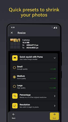 使用我们用户友好的图片压缩器,轻松压缩和调整您的照片和图片的大小。<br><br>只需选择要压缩或调整大小的图片,选择所需的压缩级别,让我们的应用程序完成其余的工作。通过我们的应用,您可以在不牺牲质量的情况下减小图片的大小,非常适合在设备上节省空间或在线分享图片。立即试用,看看不同之处!<br><br>本应用提供压缩照片的实时预览 - 在创建图像之前,您将知道它的外观以及在磁盘上占用的空间。<br><br>本应用具有三种压缩图像的模式:<br>1. 快速压缩:最简单的压缩照片方法。只需选择压缩量并点击“压缩”,应用会优化图片以节省空间,同时保持原有外观。<br>2. 压缩到指定文件大小:您可以指定照片的KB(千字节)大小,按“压缩”并让应用进行优化。当您需要将照片压缩到指定文件大小时,建议使用此功能。<br>3. 手动模式:您可以手动选择图像所需的宽度和高度以及压缩量。此模式可让您完全控制压缩和重设大小过程。<br><br>每种模式都支持批量压缩和批量调整大小。<br><br>应用特点:<br>* 免费使用<br>* 批量压缩/调整大小(多个照片压缩/调整)<br>* 将照片压缩到指定文件大小<br>* 将照片压缩到特定宽度和高度<br>* 节省设备存储空间,支持手机和平板<br>* 转换任意图像格式,支持从JPEG,JPG,PNG,WEBP格式转换<br><br>支持的图像格式:jpeg, jpg, png, webp。