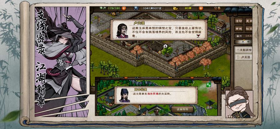 "天下风云出我辈,一入江湖岁月催。皇图霸业谈笑中,不胜人生一场醉。提剑跨骑挥鬼雨,白骨如山鸟惊飞。尘事如潮人如水,只叹江湖几人回"。 十四本天书重现江湖,掀起了新一轮的腥风血雨。主人公一不小心穿越到了这个风起云涌的武侠世界,身不由己地随着江湖的浪潮起起伏伏,经历了无数的艰难险阻和阴谋诡计之后,最终练成了绝世神功,找到了真爱,自由自在的在江湖上驰骋! 游戏的特点: 【剧情】丰富的原创剧情,繁多的分支情节,层出不穷的悬念,幽默的对白桥段,为你打造一个与其他游戏迥然不同的光怪陆离的武侠世界! 【人物】1000+个出场人物角色,每个人物都有鲜明的个性特色,故事感极强 【神功】600+个武功种类,囊括了武侠小说里几乎所有的神功秘籍,独特的武功设定,没有武学上限,你可以变得前所未有的强大 【装备】1000+种道具和装备,丰富而多变的装备设定,让每一件装备都有可能变成神兵利器 【天赋】200+的天赋设定,每个角色都有不用的武学个性,使得每个角色都显得真实而触手可及 【称号】100+的称号系统,让主人公不再在江湖中籍籍无名,与故事情节完美结合,不同的称号,在江湖的地位大不一样 【洗练】独特的洗练系统,随性所欲的定制符合自己要求的装备,让每一件装备都称心如意 【经络】独一无二的经络修炼系统,囊括了几百个穴位和奇经八脉,完全贴合武侠小说中的武功修炼之道,使得武功修炼更有挑战、更真实、更有趣 【锻造】每件装备都有巨大的成长空间,只要你去锻造和强化,一块凡铁也能成为闯荡江湖的最大依仗 【武学】平衡的武学设定,拳掌、刀、剑、奇门、内功等不同的武学修炼道路,在任何方面的修炼都可以成为绝世高手 【门派】几十个门派林立于江湖,可以虚心以求学,可以野心以吞并,可以残忍以灭门,怎么选,全看你 【招募】完成特定的任务就可以招募各种英雄于旗下,各路豪杰枭雄都唯你马首是瞻 【挂机】轻松的挂机系统,可以一边挂机一边刷副本,累了就把手机扔到一边,过几天再来收割经验 【扫荡】方便的扫荡系统,轻松获得巨量的升级经验,原来升级可以这么简单 【奖励】游戏中的奖励层出不穷,每日奖励都给你不一样的惊喜 【战斗】全自动战斗模式,解放双手,更轻松的养成角色和欣赏剧情 【副本】精彩而富有挑战的副本,大量的奖励,等你来拿 【音乐】当怀旧的音乐在你耳边响起时,宛如又穿越到了几十年前,荡气回肠,豪情万丈 独特的故事设定,包含了大量的武侠爱情情节(分支剧情,需要探索)与人生体悟,告别无聊鼓噪的打怪升级套路,每一次游戏都给您带来一种独特的体验,让您的的武侠世界充满了丝丝的柔情和人生的酸爽! 热烈欢迎各位玩家体验游戏,并提供宝贵的建议!