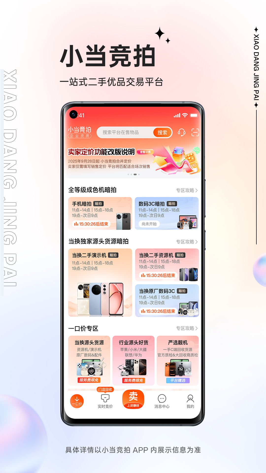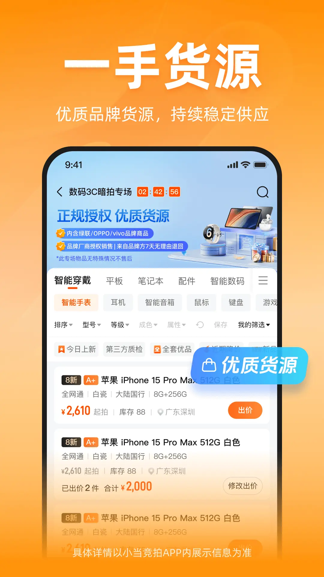 《小当竞拍》APP是专注于二手商家交易的B2B平台,由深圳市小当网络科技有限公司独立自研运营,拥有主流品牌的一手货源,品类齐全丰富。<br>- - - - - - 功能介绍 - - - - - -<br>【一手货源】<br>拥有OPPO、vivo等主流渠道提供的一手资源机、演示机,没有中间商赚差价,质美价廉;<br>【专业质检】<br>4道检测工序,38项全新等级,89道科学检测项;<br>【售后无忧】<br>线上线下专业团队,1对1售后服务 ,交易高效又无忧;<br>- - - - - -- - - - - -<br>【联系我们】<br>关注《小当竞拍》微信公众号:-联系我们-联系客服;<br>下载《小当竞拍》APP-个人中心-在线客服;<br>贴心服务,为每一个商家的买卖保驾护航。