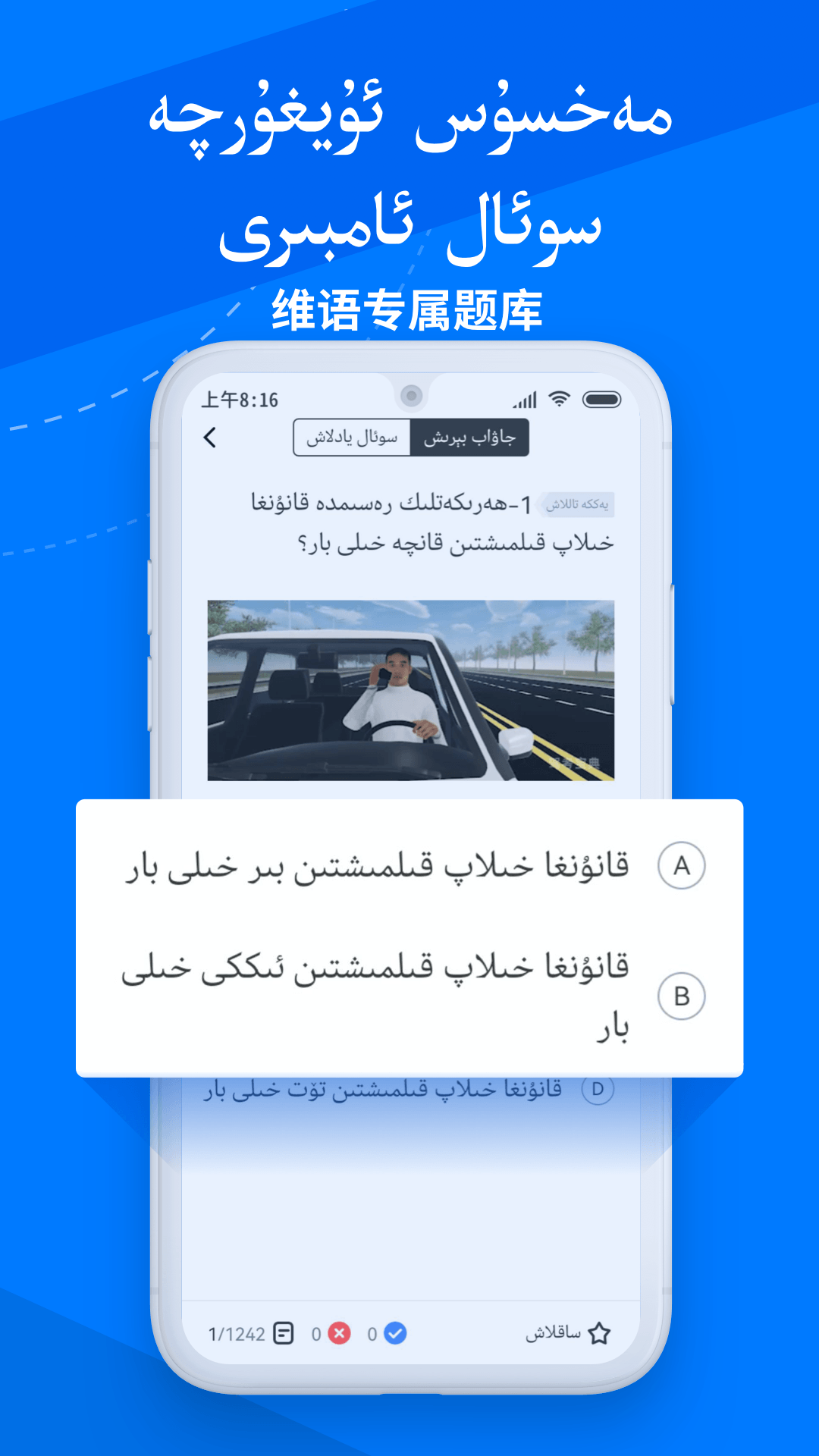 驾考宝典隆重推出维语版软件啦!本软件为维语用户量身定制的小车题库,书写延续维语用法自右向左书写,同步至全国2026年新版考试题库! 【开发背景】 少数民族语言文字造就中华文化的多样性,是中国文字史的重要组成部分,为民族文化的发展提供了重要支持。世界上大概每天有许多语言文字消失,保护民族语言文字的多样性具有重大历史意义,驾考宝典将响应号召,励志解决全国人民不同地区的学车需求。 【产品特色】 1、试题练习:顺序、随机、专项等多种练习模式,助你更快掌握理论题库 2、模拟考试:全真模拟考试,科目一、科目四考试满分通过宝典 3、错题收藏:自动收录错题、一键收藏难题,宝典帮你全方面复习 4、图标速记:巧妙记忆交通标志、交通法规,全力冲刺驾校考试 5、知识扩展:驾考易错题、重难点一键巩固,让每个学员考试无忧