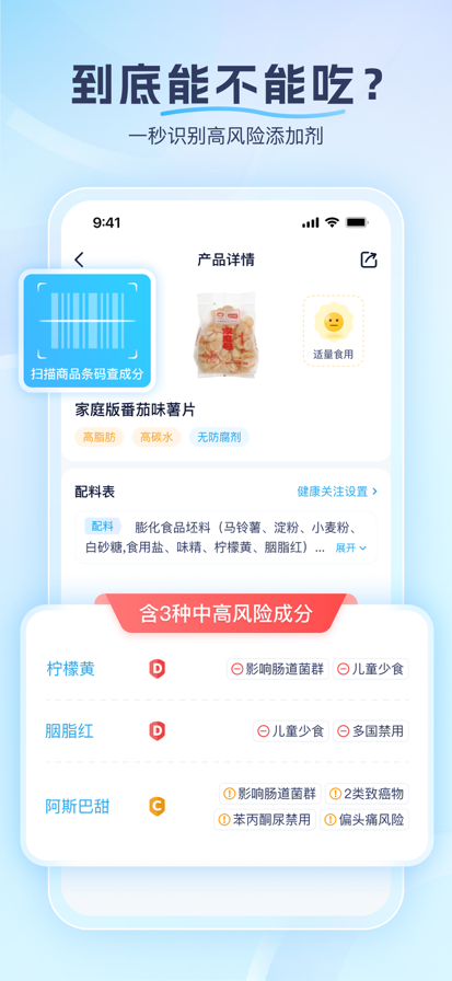 【成分喵】 — 您的食品添加剂与化妆品成分查询助手 扫码、拍照、复制商品链接,一秒查清食品添加剂和化妆品成分,拒绝科技与狠活,帮您解析配料表和成分表的秘密。 【扫码查成分】 扫描外包装条形码,快速了解食品添加剂和化妆品成分安全风险; 【拍照查成分】 拍摄产品的配料表,成分喵自动识别所含食品添加剂和化妆品成分,并标注安全与风险; 【复制商品链接查成分】 复制商品链接并粘贴到成分喵,也能查询所含成分与添加剂,支持淘宝、京东、拼多多与抖音等平台; 【看懂配料表】 不做配方师也能看懂配料表!专业化解读核心功效,直接告诉你好不好、适不适合你,告别概念性忽悠。 【个性化健康提醒】 懂你的体质助手。设置控糖、孕期等关注点,成分风险触发即自动提醒(如:控糖→提示糖分偏高)。 【成分安全评分】 基于公开的成分数据库,提供客观中立的安全评分,守护您的健康底线; 【批号查询】 输入化妆品品牌和批号,免费查询生产日期和保质期,方便管理化妆品,避免过期使用; 【食用建议】 基于配料表和营养成分表,提供科学的食用建议,清晰帮您了解到底该不该吃。 成分喵APP没有广告、客观中立,完全站在用户角度帮助大家识别安全风险,请立即下载成分喵,守护您的健康生活!