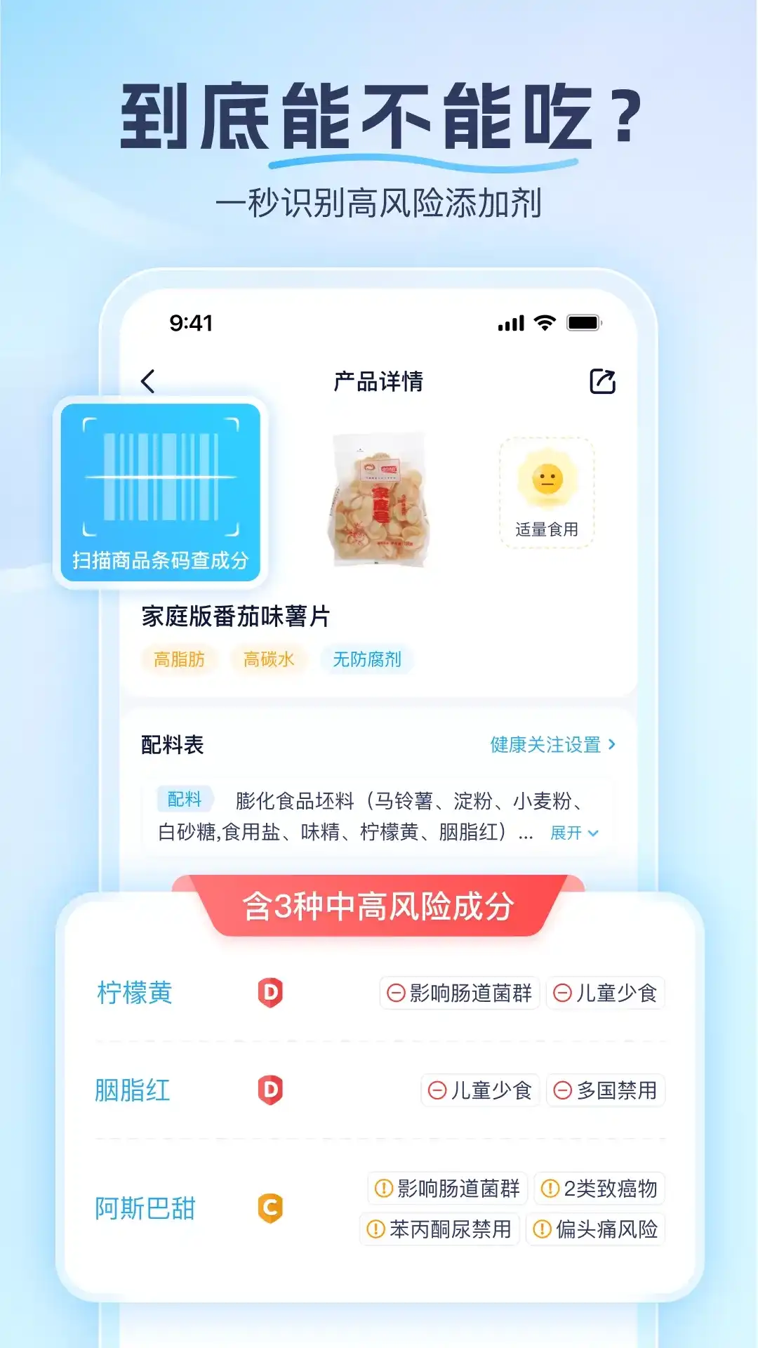 【成分喵】 — 您的食品添加剂与化妆品成分查询助手 扫码、拍照、复制商品链接,一秒查清食品添加剂和化妆品成分,拒绝科技与狠活,帮您解析配料表和成分表的秘密。 【扫码查成分】 扫描外包装条形码,快速了解食品添加剂和化妆品成分安全风险; 【拍照查成分】 拍摄产品的配料表,成分喵自动识别所含食品添加剂和化妆品成分,并标注安全与风险; 【复制商品链接查成分】 复制商品链接并粘贴到成分喵,也能查询所含成分与添加剂,支持淘宝、京东、拼多多与抖音等平台; 【看懂配料表】 不做配方师也能看懂配料表!专业化解读核心功效,直接告诉你好不好、适不适合你,告别概念性忽悠。 【个性化健康提醒】 懂你的体质助手。设置控糖、孕期等关注点,成分风险触发即自动提醒(如:控糖→提示糖分偏高)。 【成分安全评分】 基于公开的成分数据库,提供客观中立的安全评分,守护您的健康底线; 【批号查询】 输入化妆品品牌和批号,免费查询生产日期和保质期,方便管理化妆品,避免过期使用; 【食用建议】 基于配料表和营养成分表,提供科学的食用建议,清晰帮您了解到底该不该吃。 成分喵APP没有广告、客观中立,完全站在用户角度帮助大家识别安全风险,请立即下载成分喵,守护您的健康生活!